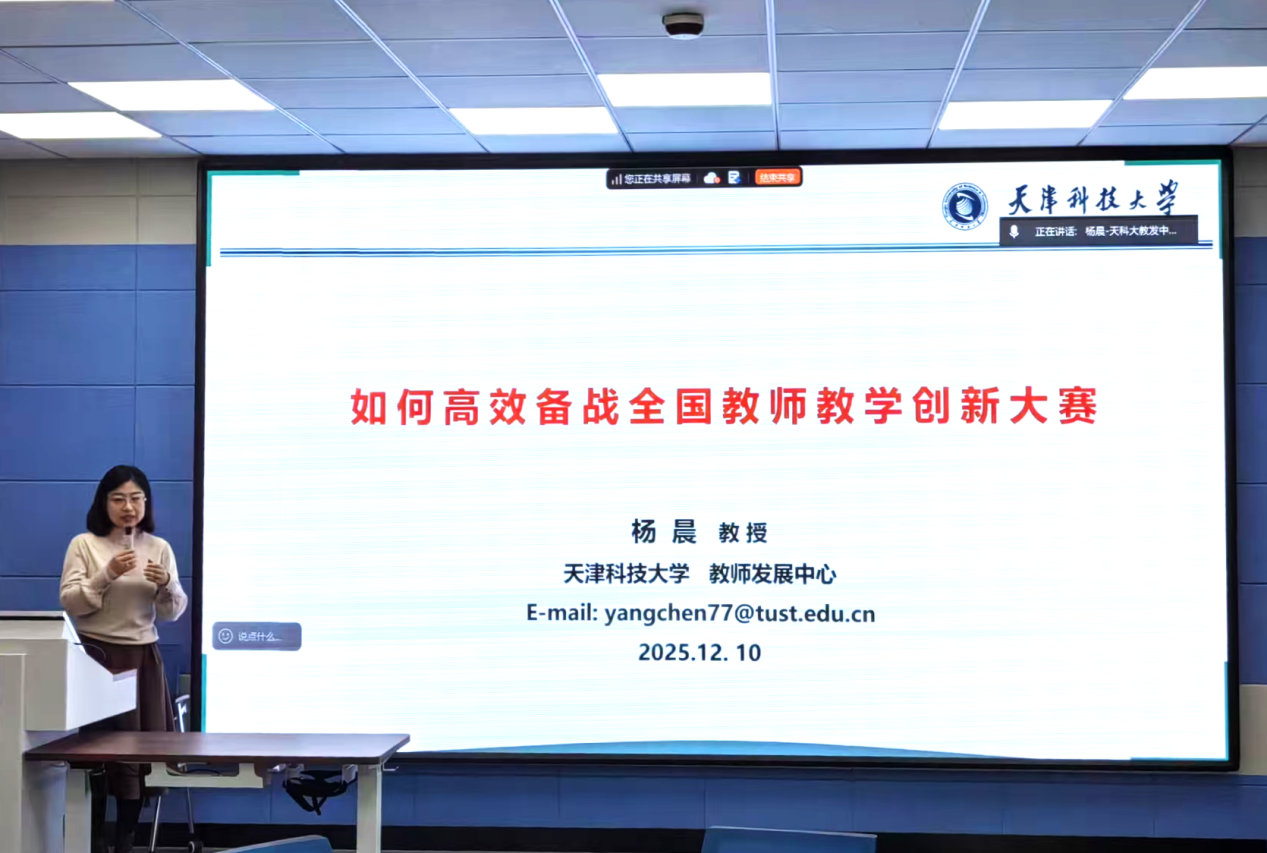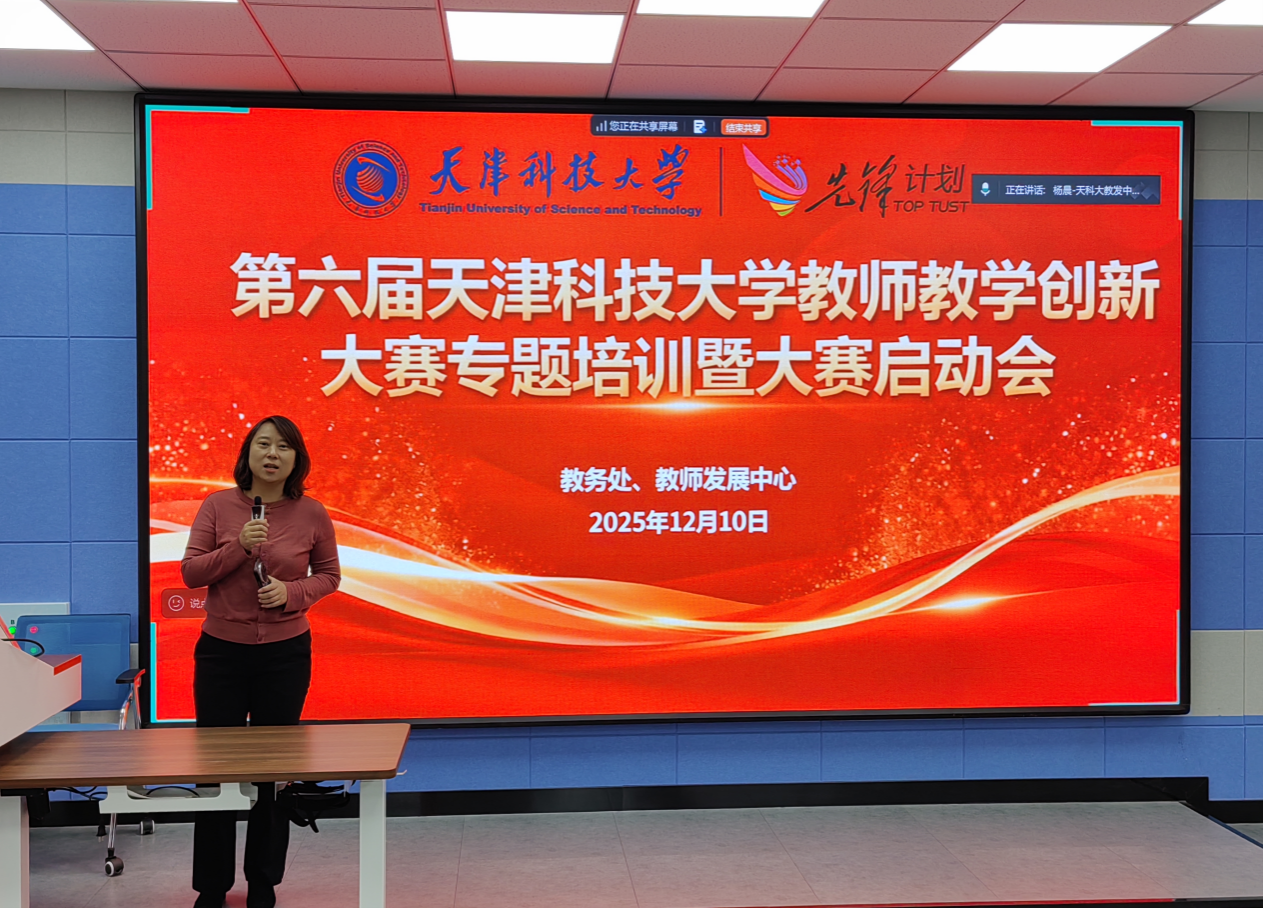 为深入推进“四新”建设,深化产教融合,助力教师提升教学创新核心素养,做好校级及全国高校教师教学创新大赛备赛工作,12月10日下午,由教务处、教师发展中心联合主办的“第六届天津科技大学教师教学创新大赛专题培训暨启动会”在滨海校区中院图书馆第六绘图室顺利举行。会议通过“线下举办+线上直播”相结合的方式开展,学院教学院长、拟参赛教师等共同参加,线上腾讯会议同步直播,氛围热烈。
