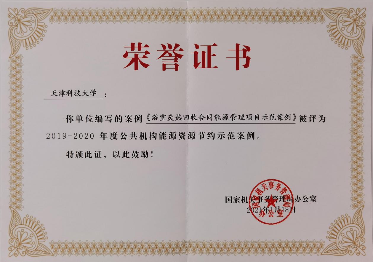 近日,从“天津市公共机构能源资源节约暨碳达峰碳中和工作综合推动会议”上获悉,我校获得 “国家级公共机构水效领跑者”荣誉称号。我校编写的案例《浴室废热回收合同能源管理项目示范案例》被国家机关事务管理局评为2019-2020年度公共机构能源资源节约示范案例。
