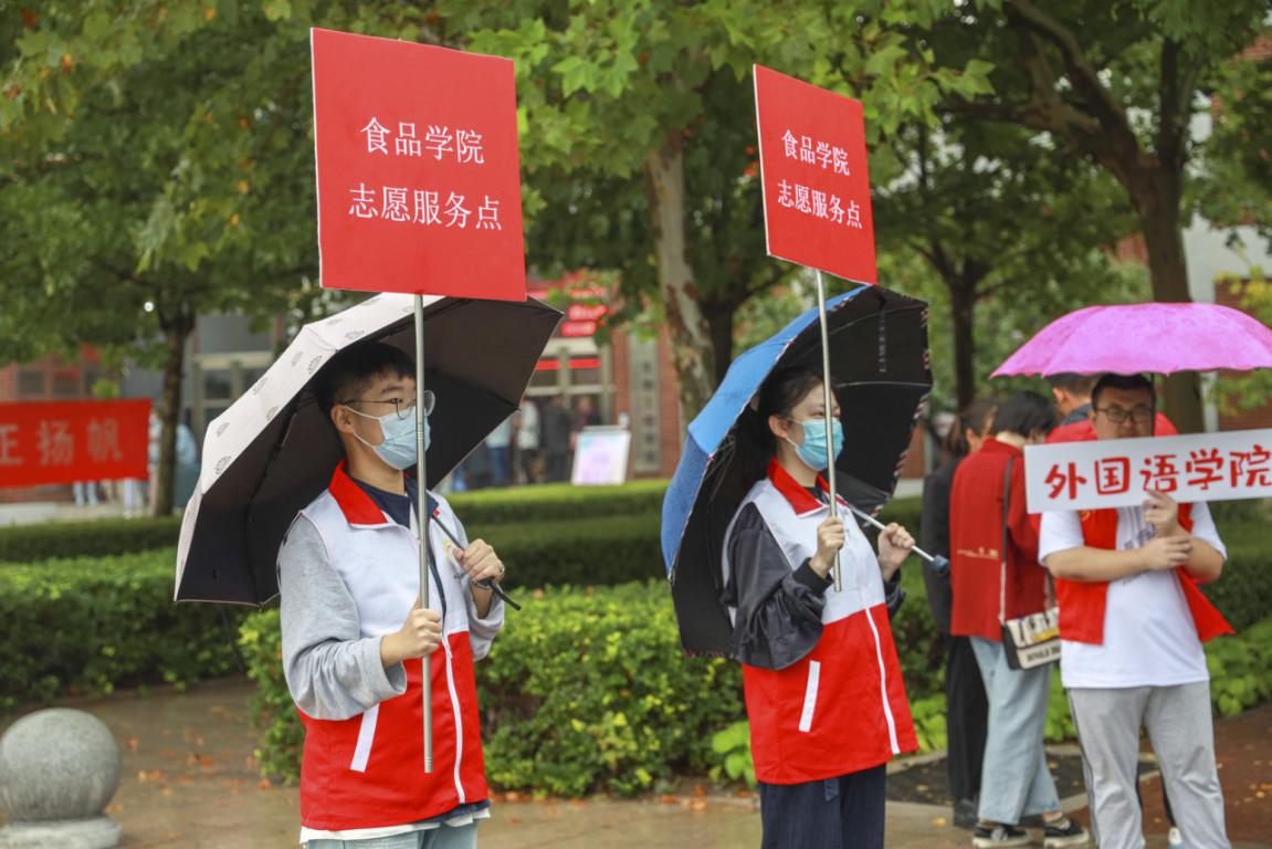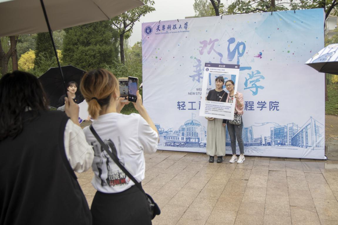 秋雨挡不住家长和新生们的激动脚步,校园内人潮涌动,各类迎新横幅和创意海报渲染出热情温暖的氛围,形成了一道亮丽的风景线。滨海校区和河西校区的迎新现场有条不紊、秩序井然。