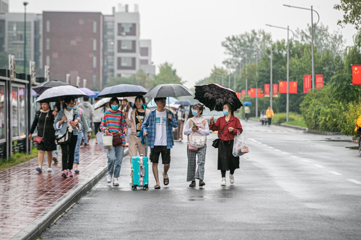 “来科大就对了!冒着这么大的雨,好多老师的衣服都湿了,还对我们笑脸相迎,工作人员主动帮我拉行李拖箱子,好感动!以后一定好好学习,找个体面工作!”刚刚从摆渡车下来的新生黄家祺,好心情丝毫没有受到天气影响。