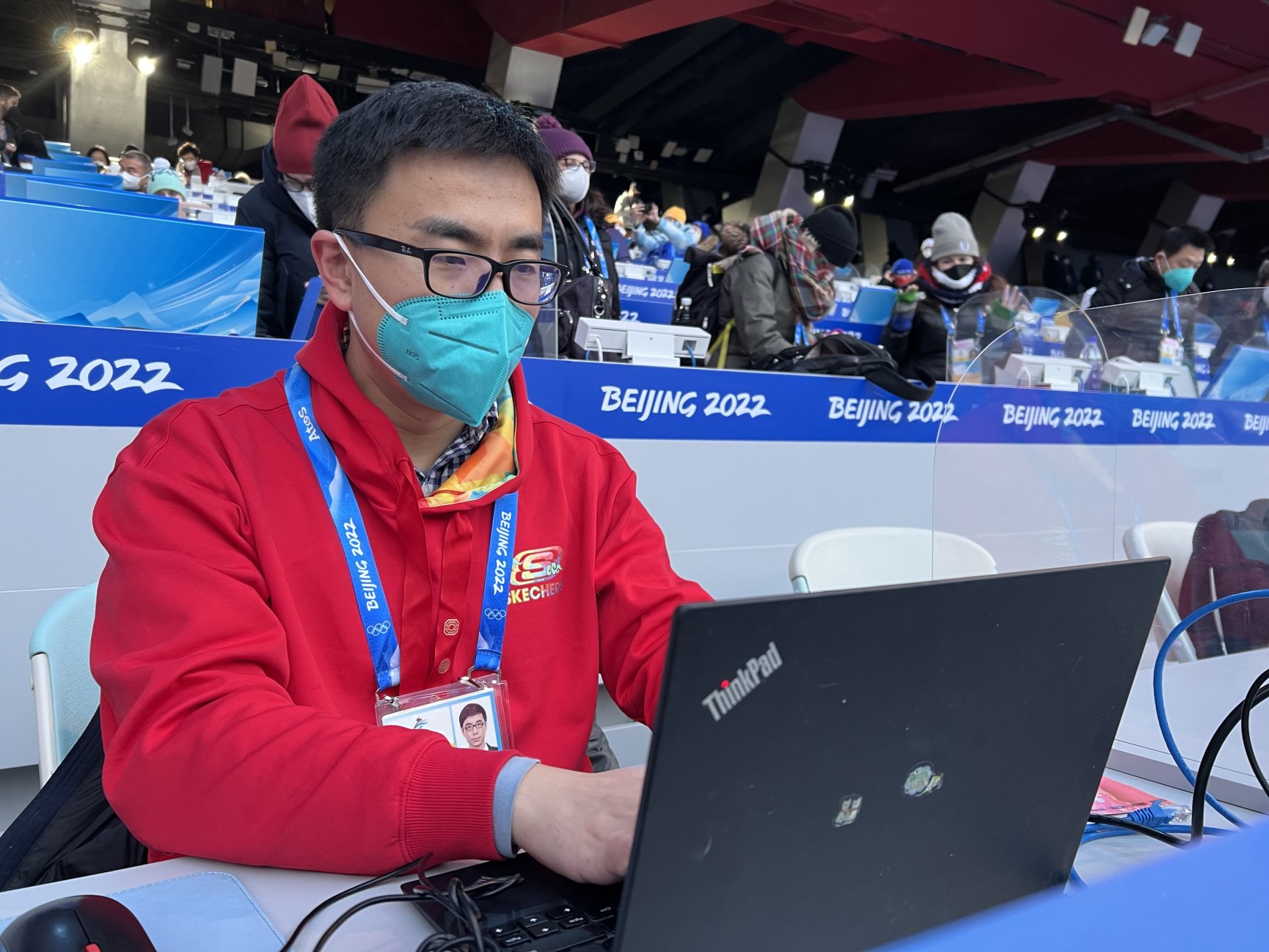 图为杨迅在北京冬奥会开幕式现场写稿