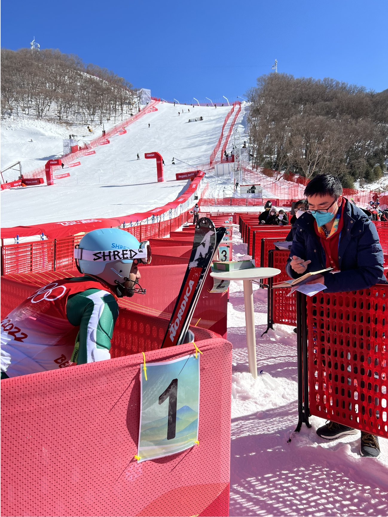 他在朋友圈里说: 巴基斯坦此次派出了高山滑雪运动员穆罕默德·卡里姆参加北京冬奥会,作为代表团唯一的运动员,他也是开幕式巴基斯坦代表团的旗手。我一直在和卡里姆约采访,考虑到他的训练备赛,决定赛后聊聊。今天一早赶到高山滑雪中心,卡里姆倒数第二个出场,可惜出现了失误。见面后,他有些沮丧,我们击拳问候,我用乌尔都语为他鼓劲。采访开始后,他的脸上出现了笑容。卡里姆说,结果很遗憾,但会继续努力,接下来在中国的几天也会接着训练。我为他加油,祝他不断超越,在下届冬奥会取得好成绩。