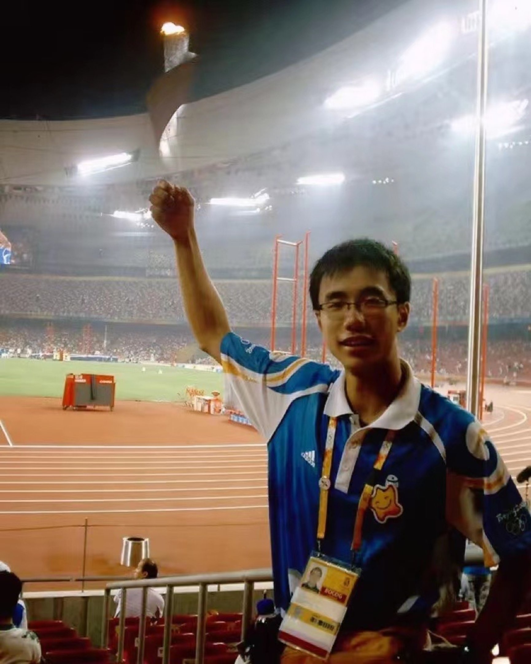 图为2008年,杨迅担任北京奥运会志愿者时,在国家体育场留影