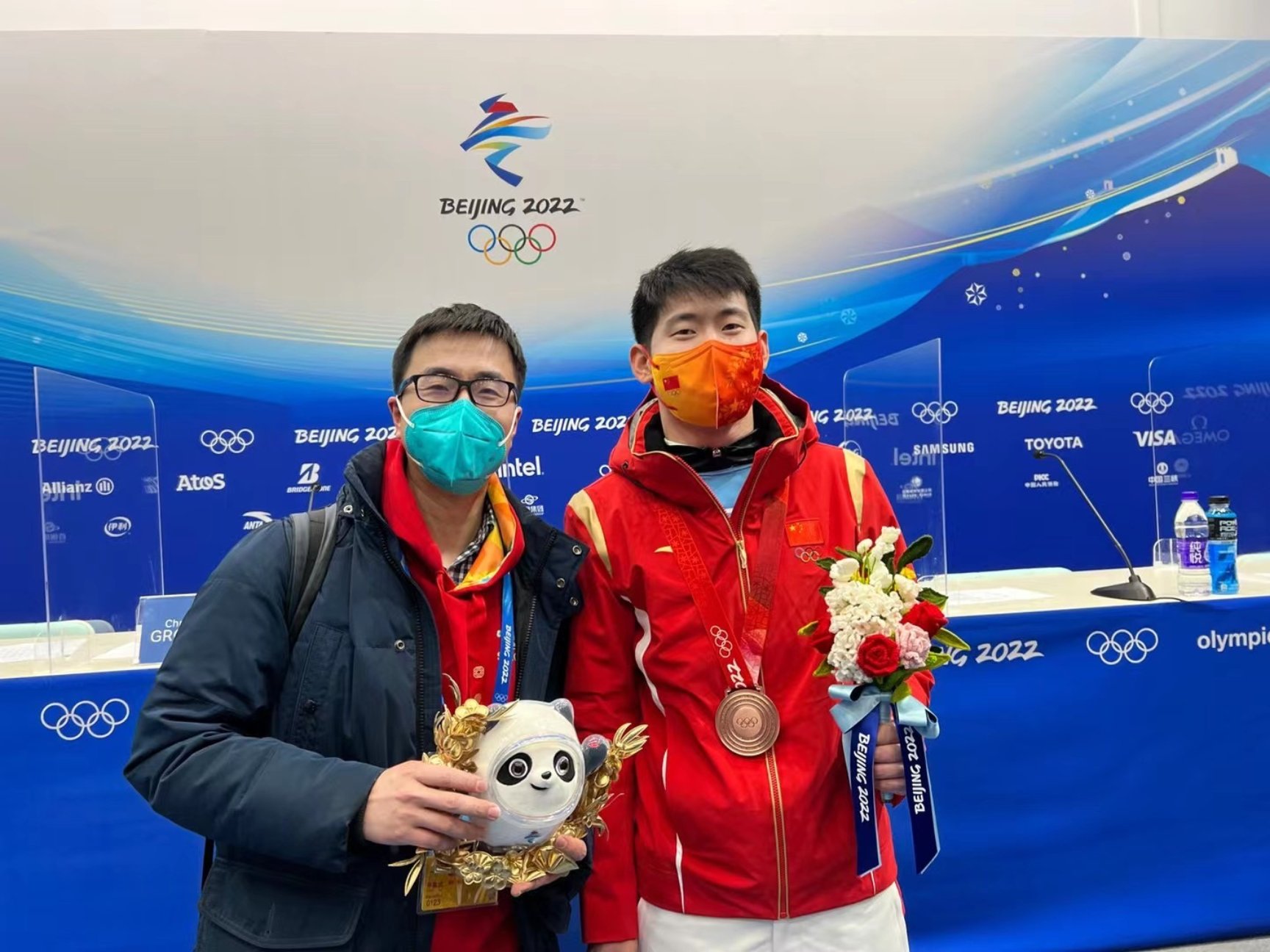 图为杨迅在采访北京冬奥会男子钢架雪车比赛铜牌获得者闫文港后,现场合影