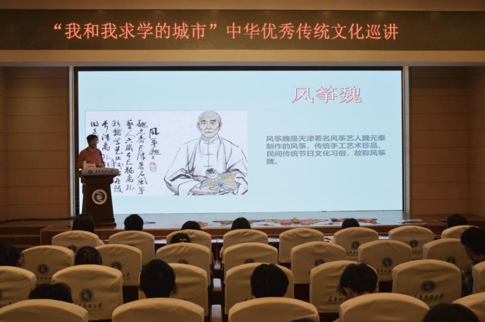 为深入学习宣传贯彻党的二十大精神,持续推进中华优秀传统文化教育和爱党爱国爱社会主义教育,引领青年学子了解天津、热爱天津、建设天津。近日,我校在滨海中校区逸夫楼报告厅开展“我和我求学的城市—中华优秀传统文化巡讲”活动。本次宣讲邀请到了国家级非物质文化遗产项目代表性传承人、“风筝魏”第四代传承人魏国秋主讲。海洋与环境学院承办,各学院学生代表230余人参会。
