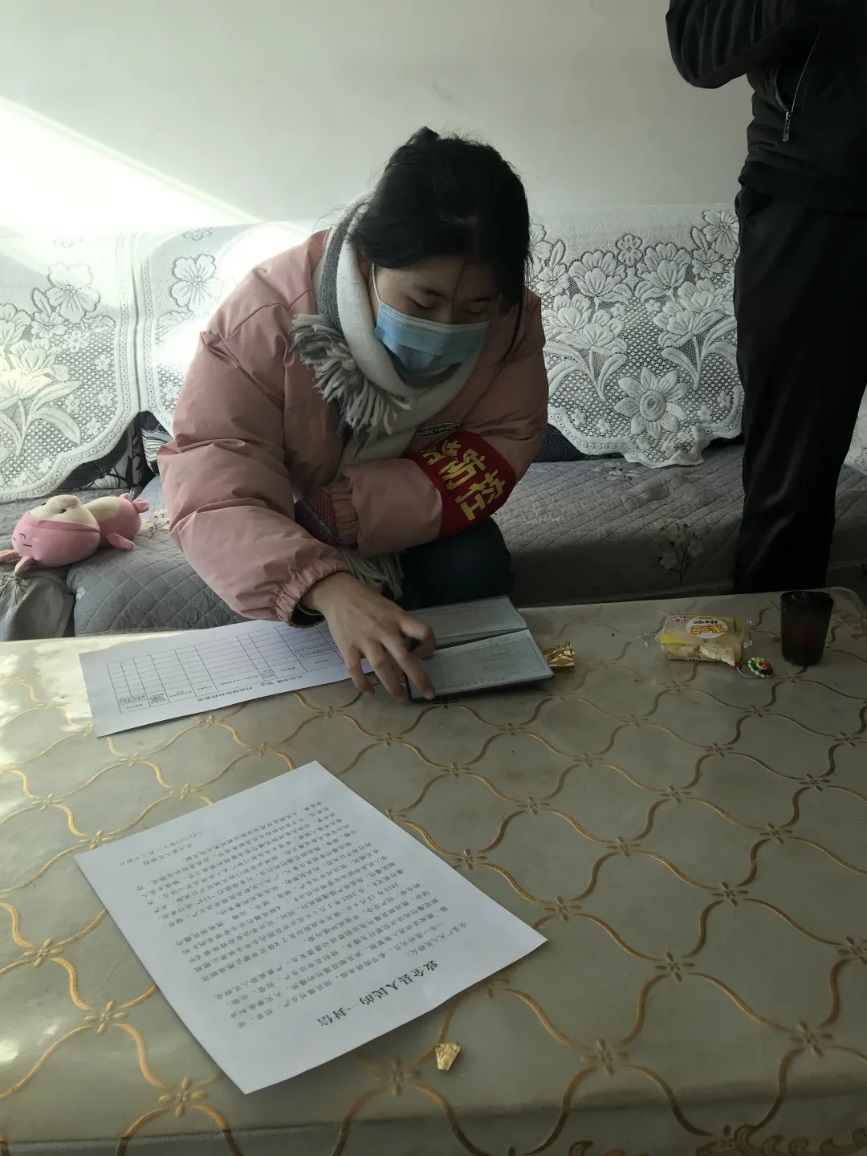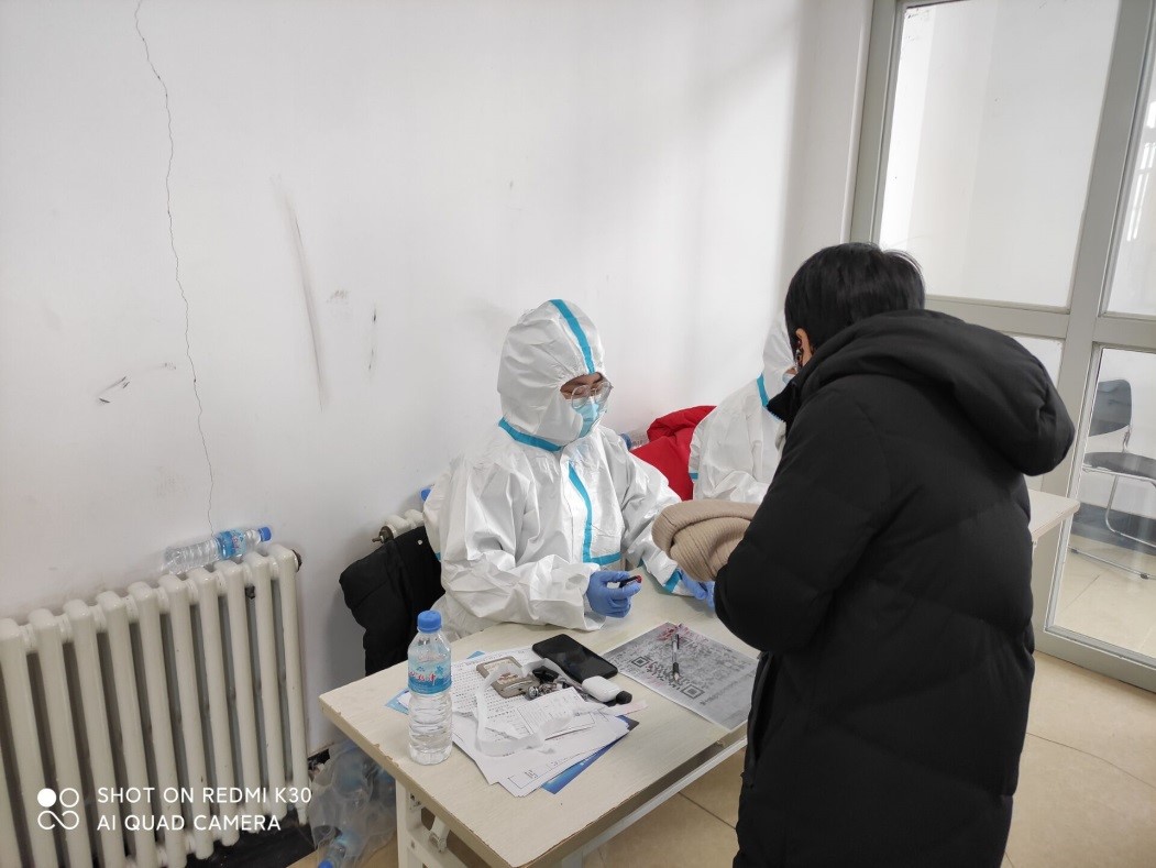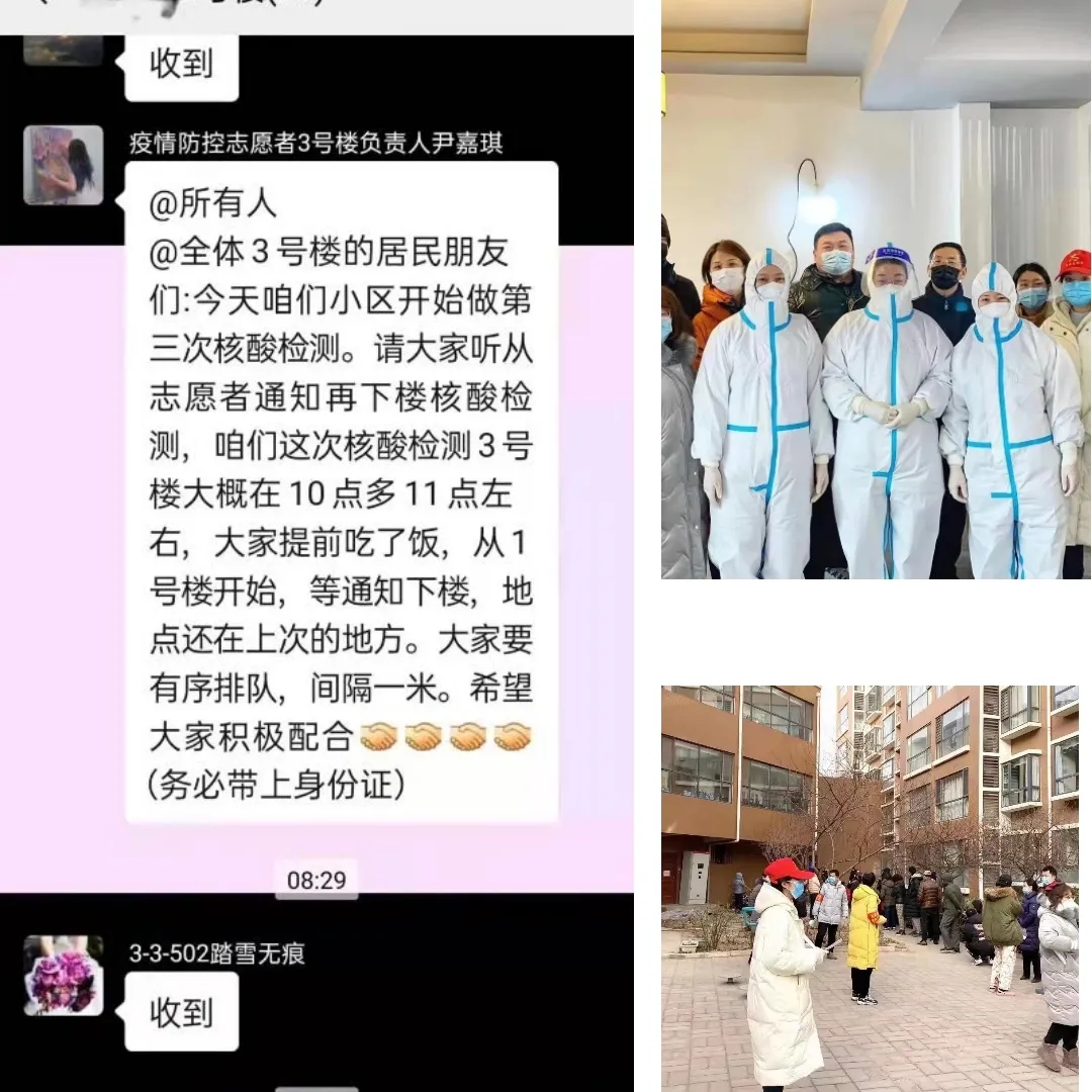 为了确保核酸检测不漏一人,按社区党组织要求,根据居民户数和人数,协助社区党组织连夜开展拉网式排查。核酸检测时正值石家庄市最低气温——零下十六度,我们早上6:00集合,进行培训,布置核酸检测现场,入户通知居民做好核酸前的准备。我和居民面对面建群,建立了线上线下的沟通和交流,第一时间推送检测现场信息,解答居民疑惑,引领居民有序进行检测,为了减少居民在瑟瑟寒风中的等候时间,保证不聚集,避免等候过长,我按单元顺序引导他们排队按批次检测。在核酸检测现场,疏导秩序,提醒他们不聚集,不扎堆,保持有效距离。为了使大家尽快的恢复正常生活,在低温的恶劣天气里,即使手脚被冻得毫无知觉,依旧坚守在疫情最前沿。
