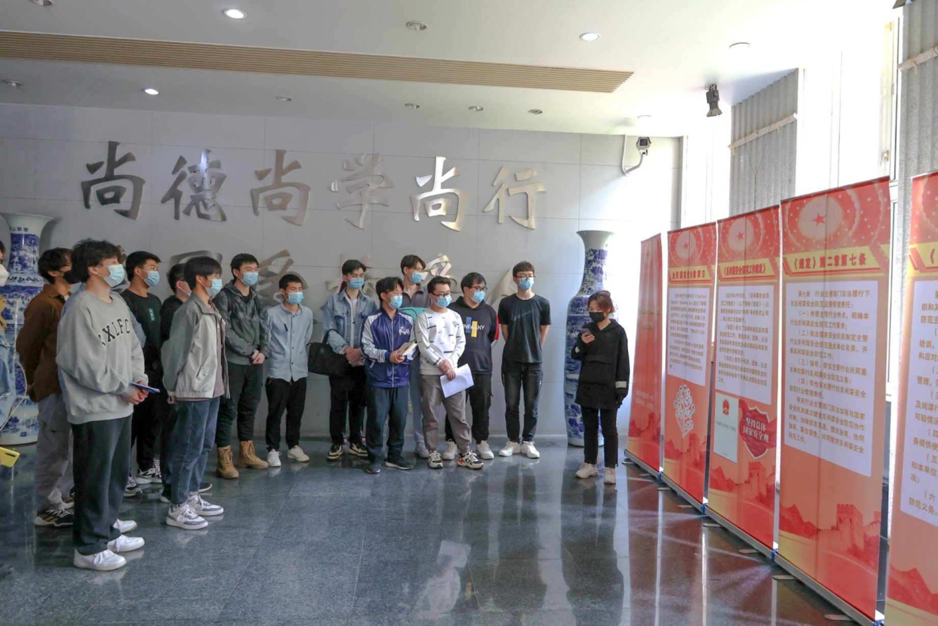 为贯彻落实习近平总书记提出的“总体国家安全观”,使国家安全意识入脑入心,党委安全工作部与保密委员会办公室联合举办了“共同构筑维护国家安全钢铁防线”国家安全教育主题展。主题展在河西校区主楼大厅举行。首页摆放着“国家利益高于一切,国家安全人人有责”的醒目海报。展览板前,工作人员为参观者分发《中华人民共和国反间谍法》《反间谍安全防范工作规定》宣传手册,讲解员通过介绍《国家安全法》《国家情报法》《反恐怖主义法》《反间谍法》和《保守国家秘密法》等相关法律知识,围绕《中华人民共和国反间谍法》《反间谍安全防范工作规定》制定的重要意义、反间谍安全防范工作应遵循的原则、主要工作规定、网络攻击和窃密案例、线索举报电话等方面为同学们作了深入浅出的讲解,使大家受益匪浅。