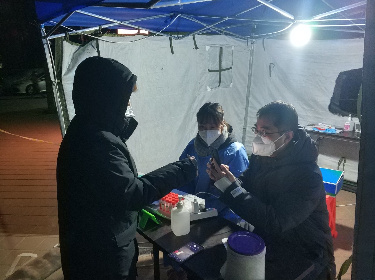 12日,北辰区瑞景街道紫瑞园开展第二次大规模核酸检测,外国语学院日语系党支部书记、主任赵俊槐积极响应党组织号召,主动报名参加防疫工作,承担第5、6通道居民信息登记任务。期间收到组织部门下沉社区的通知,继续延长工作时间,直到深夜。因为天气寒冷,扫码登记居民信息无法采取过多保暖措施,连续工作12个小时下来,双手已冻僵,大家咬牙坚持住了。经过紧张而有序的奋战,同组4人共完成1300人的登记工作,顺利完成居委会交给的任务。作为系主任,假期里仍然有繁重的业务工作需要完成,一边是专业建设方案工作日程紧张,一边是疫情防控任务紧迫,他合理安排,顺利完成了两方面的工作任务。赵俊槐说“作为一名党员,应主动担当疫情防控任务,冲在抗疫第一线,这既是一种责任,更是一份荣耀。相信在党中央和各级党委领导下,新冠肺炎将再次清零,我们将依然生活在风清气朗中。”