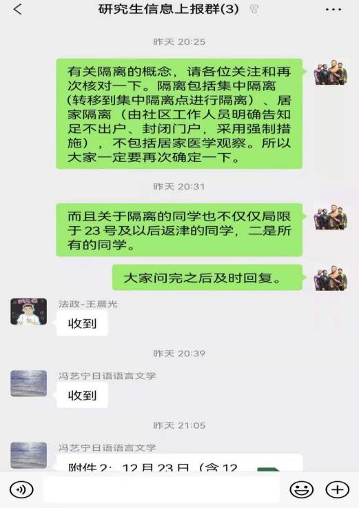 身处本次疫情的中高风险地区,外国学院日语系副主任李敏主动请缨,志愿服务津南区金地格林社区的疫情防控工作。12日,接到下沉社区参加防疫工作的通知,将家中刚刚扭伤的孩子托付给父母照看,她和爱人一起立即奔赴集结地。经历了漫长的筹备和等待后,终于在当晚19:30左右全副武装上岗工作。扫码、扫身份证,两小时轮一次岗,大家相互支持一直奋战到深夜。“虽然数九寒冬,北风呼啸,但是为了战胜疫情,医护人员坚守岗位,志愿者们无怨无悔,居民们有序排队,服从指挥。期间,有的居民送来暖手水瓶,有的送来了暖水袋,还有人带来了姜汤……我再一次感受到了这个城市的坚韧和温暖!”今天是李敏参加防疫工作的第三天,她以实际行动诠释着共产党人的初心和使命。“疫情不退,我们不散!津南加油!天津加油!”