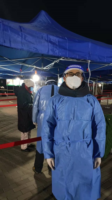 随着疫情形势进一步严峻,津南区领世郡小区随即实行“只进不出”管制,外国语学院副院长,英语系党支部党员江治刚主动与社区网格员联系人联系,要求参加社区防疫工作。接到社区具体任务后,他马上携带个人电脑到居委会报到投入工作,经过1个多小时的奋战,完成了110人参加“二筛”人员的信息录入。12日下午他接到上级组织部门的通知,以抽调干部身份下沉社区再次投入疫情防控工作。本次任务是在核酸检测点维持秩序,实行三班倒工作制度,完成工作已是深夜4点半。深夜寒风凛冽,眼镜被呼出的水汽模糊了,站时间长了,全身冻透了,脚冻得有些疼。“看着邻居们能够顺利完成检测,看着孩子们好奇而善意的眼神,听着老人们口中的‘谢谢,你们辛苦了’,嘱咐我多穿衣服,拿着居民送来的‘热水瓶’,不仅困意全无,而且心里暖暖的。”他坚定地说:“大家在疫情面前展示出来的理解与配合,让我对战胜奥密克戎更有信心。作为党员我一定要坚持到最后,按时完成党交给的任务,让老百姓放心”。