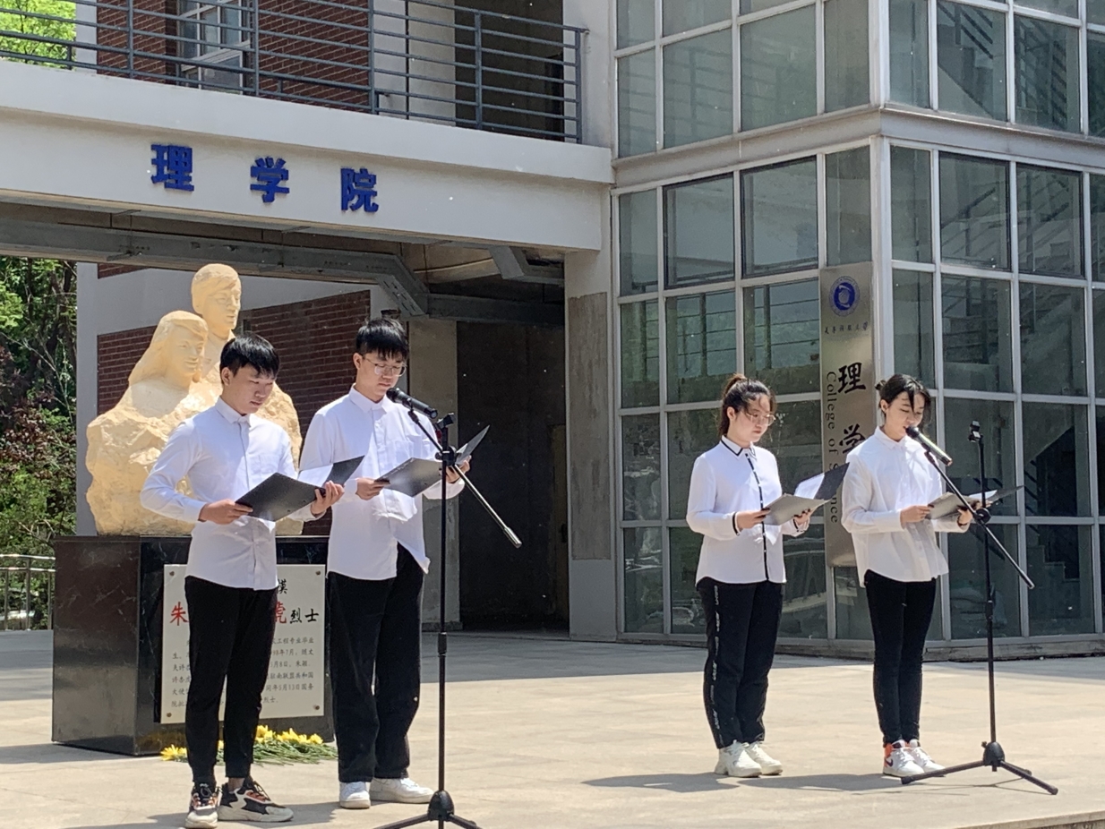随后第二十四届朱颖班代表带来诗朗诵《追忆朱颖》,四位同学以沉痛的心情缅怀朱颖烈士,表达对朱颖烈士的深切悼念与无限敬仰。第二十五届朱颖候选班学生代表进行发言时,她带领同学们回顾了朱颖烈士的生平,并号召全体学生要以朱颖为榜样,通过了解和学习先烈事迹及精神,体会往昔峥嵘岁月,明白当下生活来之不易,更好地传承红色基因,为社会主义事业的发展贡献绵薄之力。