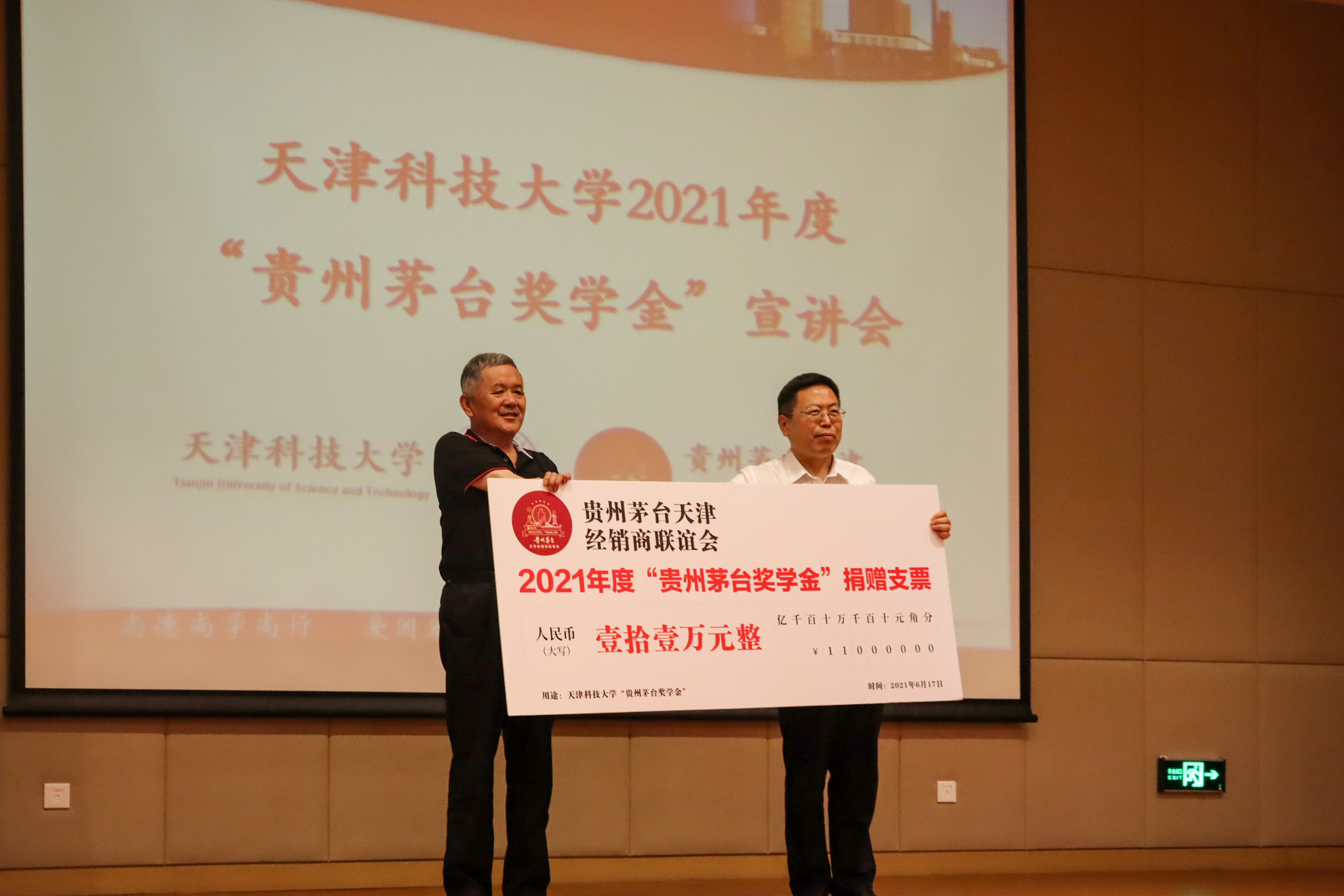 2018年,茅台集团倡导发起、贵州茅台天津经销商联谊会出资在我校设立“贵州茅台奖学金”奖项。奖学金每年评选一次,旨在积极推进我国发酵行业人才培养,加强企业和高校联系,推进校企产学研合作,积极鼓励科大优秀学子创新创业,在全校范围持续选拔和培养优秀的酒文化爱好者、酒文化精神的传承者和酒文化创新活动的践行者。