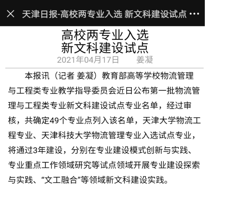 2021年4月17日,教育部高等学校物流管理与工程类专业教学指导委员会近日公布第一批物流管理与工程类专业新文科建设专业试点名单。天津科技大学物流管理专业入选试点专业。