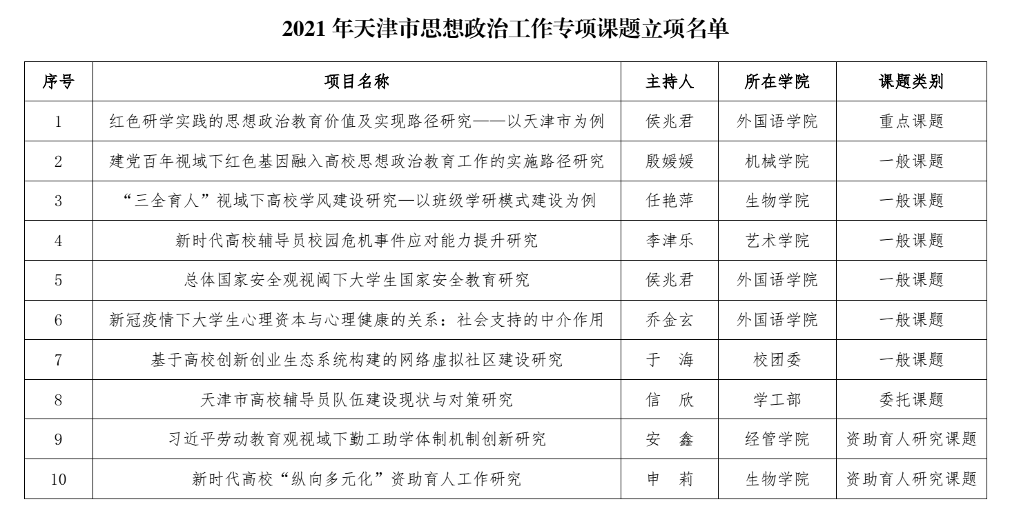 近日,天津市教育两委下发《市委教育工委市教委关于公布2021年天津市思想政治工作专项课题立项名单的通知》,我校10项课题获批立项。