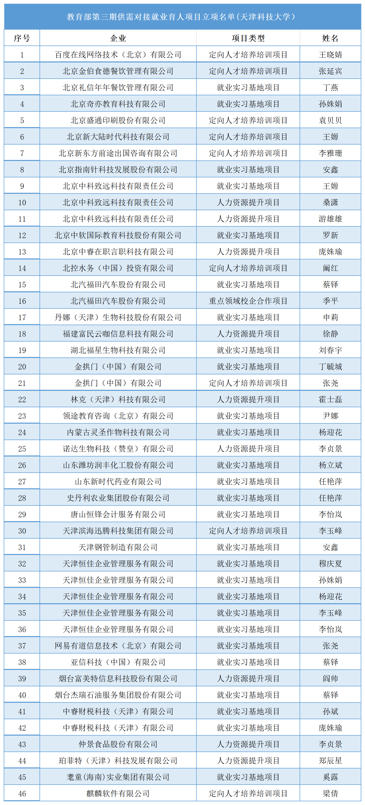 日前,教育部高校学生司发布了《关于公布教育部第三期供需对接就业育人项目立项名单的通知》,经高校与用人单位联合申报,专家审核,确定了教育部第三期供需对接就业育人项目立项名单,我校46个项目获批教育部第三期供需对接就业育人项目,与第二期相比增加25个,立项数量位列天津市属高校第一。