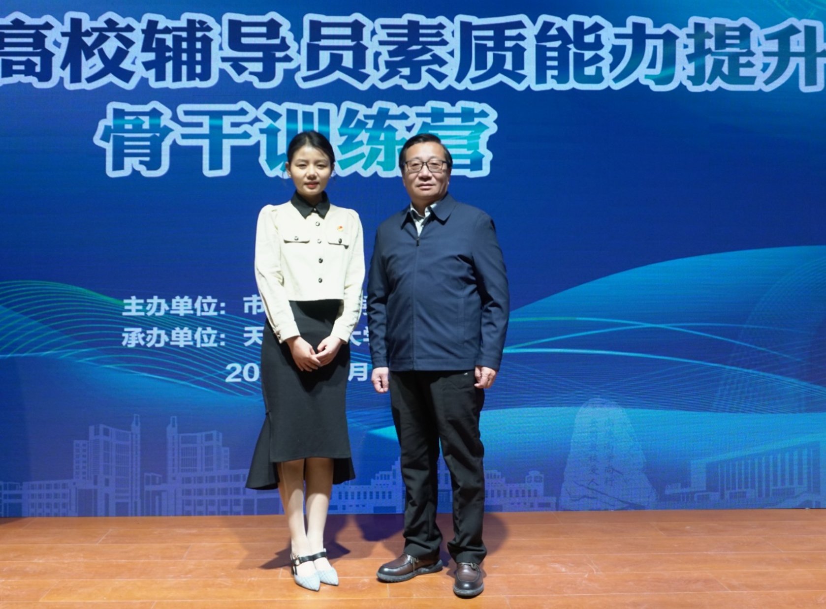 天津市高校辅导员素质能力提升骨干训练营是深入学习贯彻习近平新时代中国特色社会主义思想和党的二十大精神、落实《普通高等学校辅导员队伍建设规定》的重要举措。市教育两委旨在将训练营打造成为高校辅导员提升理论水平、职业能力和专业素养的工作载体和抓手。自11月份开营以来,来自全市各高校百余名辅导员骨干代表参与基础知识测试、案例分析展示、谈心谈话展示等环节,我校申莉老师依托扎实的基础和充分的准备,成功进入成果展示环节参与“天津市普通高校十佳辅导员”的角逐,代表我校展示辅导员队伍的精神面貌和素质能力,并取得可喜成绩。