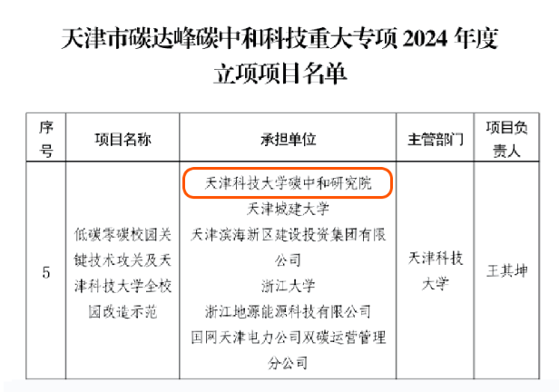 近日,天津市科学技术局公示了2024年度碳达峰碳中和科技重大专项的立项名单,共支持7项科技项目立项。其中,我校碳中和研究院牵头申请的“低碳零碳校园关键技术攻关及天津科技大学全校园改造示范”项目成功获得立项。