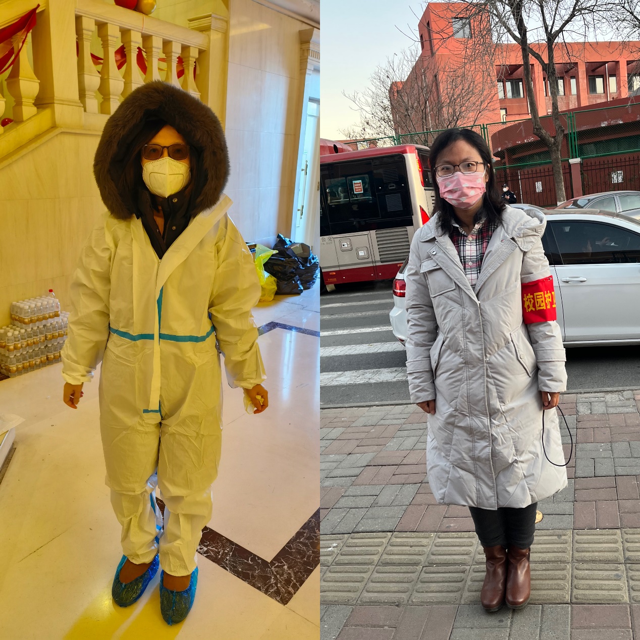 图2 罗新老师参加社区大筛志愿工作,赵青老师在社区门口小学进行秩序维护