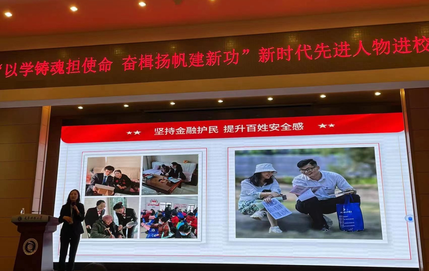 金慧琼以照片分享的形式重温了党的二十大盛况,从青年人视角,立足自身岗位,用十年来坚守金融行业一线的切身体会,以轻松易懂的话语,带领大家深入领会学习了党的二十大报告内容,感悟了习近平总书记在党的二十大上勉励广大青年的讲话,鼓励广大学生要怀抱梦想又脚踏实地,敢想敢为又善作善成,立志做有理想、敢担当、能吃苦、肯奋斗的新时代好青年。