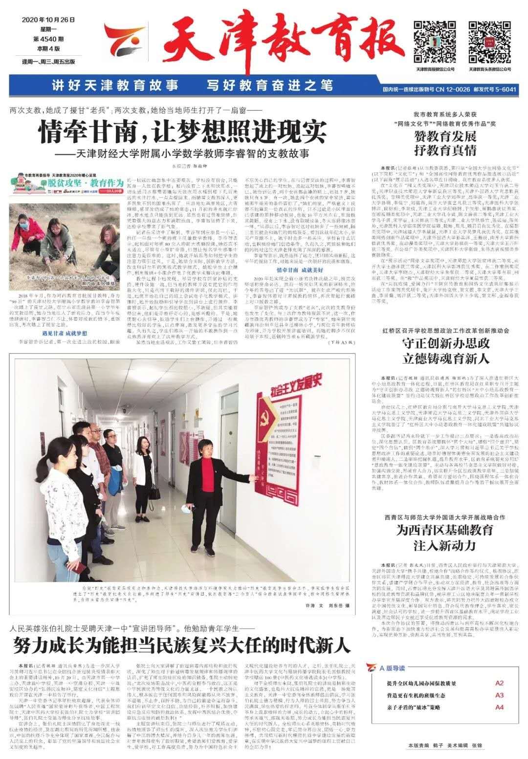 10月26日,《天津教育报》头版图片新闻报道我校四史进宿舍工作,我校海洋与环境学院为了使“四史”教育更具吸引力和亲和力,大力推动了“四史”教育进宿舍工作。学院在宿舍区建立了“四史”教育红色文化长廊,并组建了师生“四史”宣讲团,依托教育部“三全育人”综合改革试点学院平台、宿舍网格化管理体系,为师生常态化宣讲“四史”。现将报道转载如下: