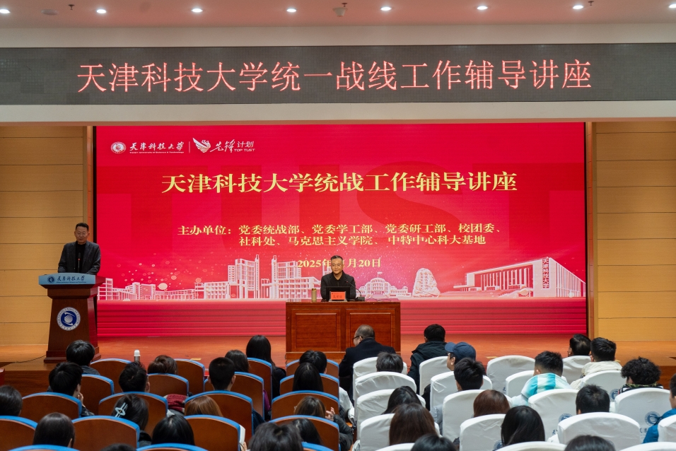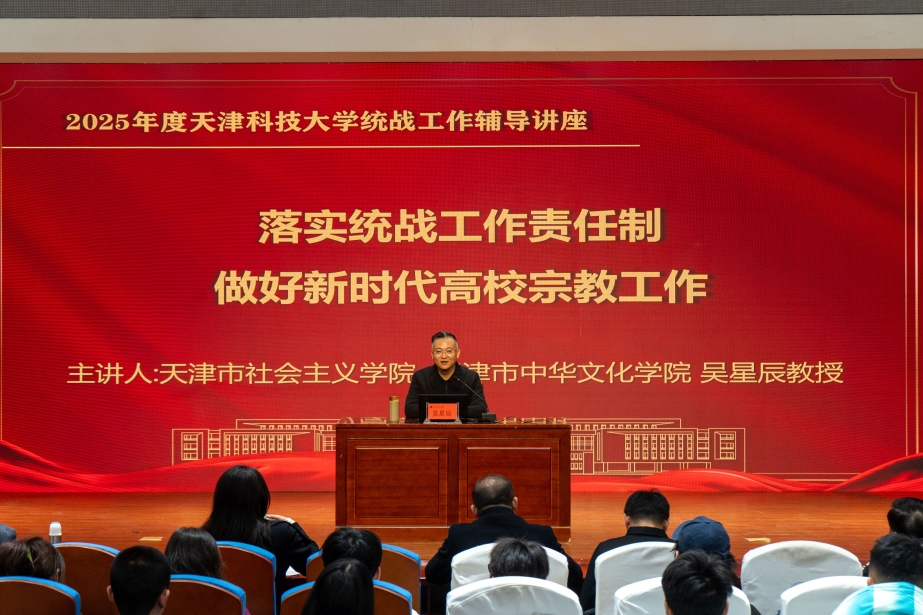 为深入学习领会关于做好新时代党的统一战线工作的重要思想,全面贯彻落实党中央关于统一战线工作的决策部署,进一步压实统战工作责任制,提升学校统战工作水平,近日,天津科技大学特邀天津市社会主义学院教授吴星辰来校作专题辅导讲座。全校基层统战委员、统战工作联络员、马克思主义学院师生代表、各学院辅导员、青马工程学员、研究生支教团成员、学生社团负责人及从事相关理论研究的教师等近200人参加学习。讲座在学校滨海校区中院逸夫楼报告厅举行,由校党委常委、统战部负责同志主持。