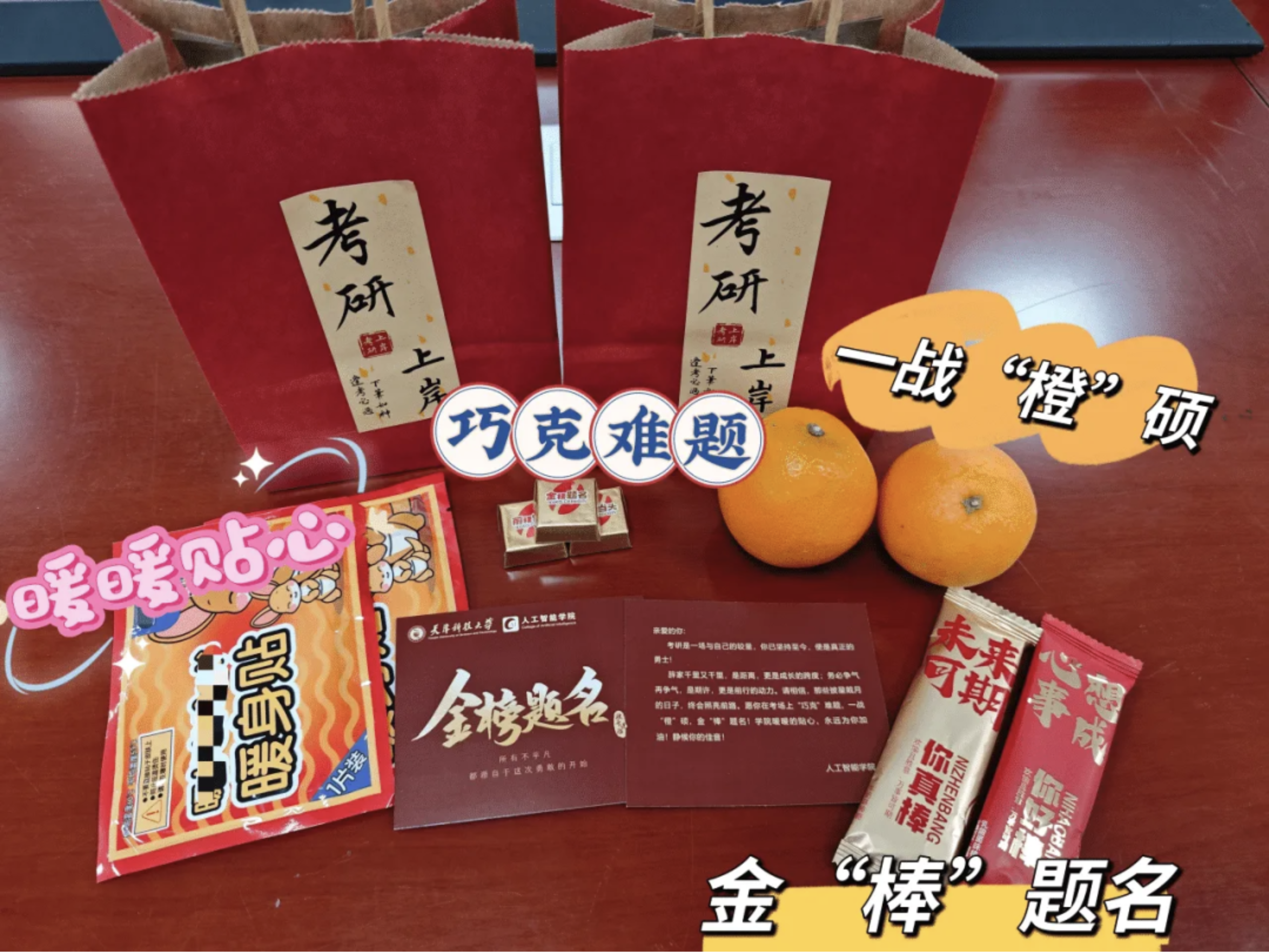 为帮助考生提振信心、做好考前准备,各学院纷纷开展形式多样的暖心行动,为考生送上“考研加油包”、暖心水果等物资,为寒冷冬日里挑灯夜战、辛苦备考的考研学子们送去衷心祝福和温情关怀,助力考生“研考上岸”。尚行学部召开考前关爱赋能会,定制笔记本套装为学子加油鼓劲;食品科学与工程学院、海洋与环境学院制作暖心加油视频,精心准备满载期许的考研“加油包”;机械工程学院、生物工程学院在一站式辅导员工作站开展慰问活动,暖心礼包传递实在关怀;外国语学院启动“暖冬助研”活动,教师手写定制祝福明信片,以笔墨传递牵挂;人工智能学院、轻工科学与工程学院举办动员暨慰问会,帮助学子缓解压力、提振士气,助力大家以最佳状态迎战考试。
