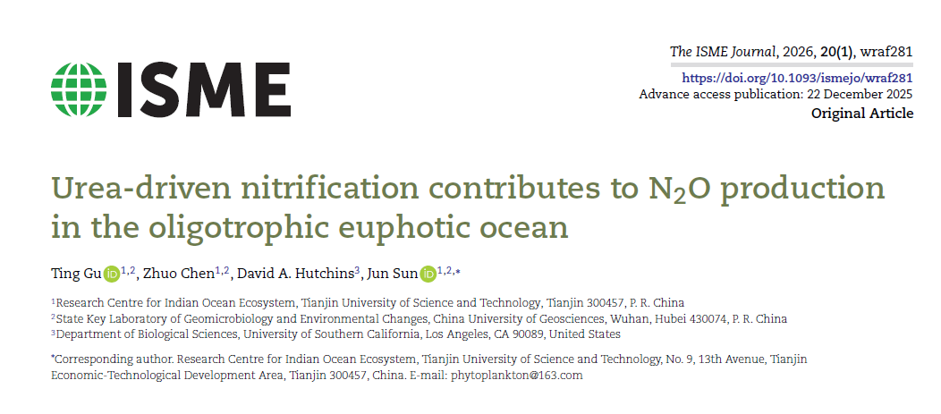 论文信息:Gu, T., Chen, Z., Hutchins, D. A., Sun, J. (2025). Urea-driven nitrification contributes to N2O production in the oligotrophic euphotic ocean. The ISME Journal, wraf281.