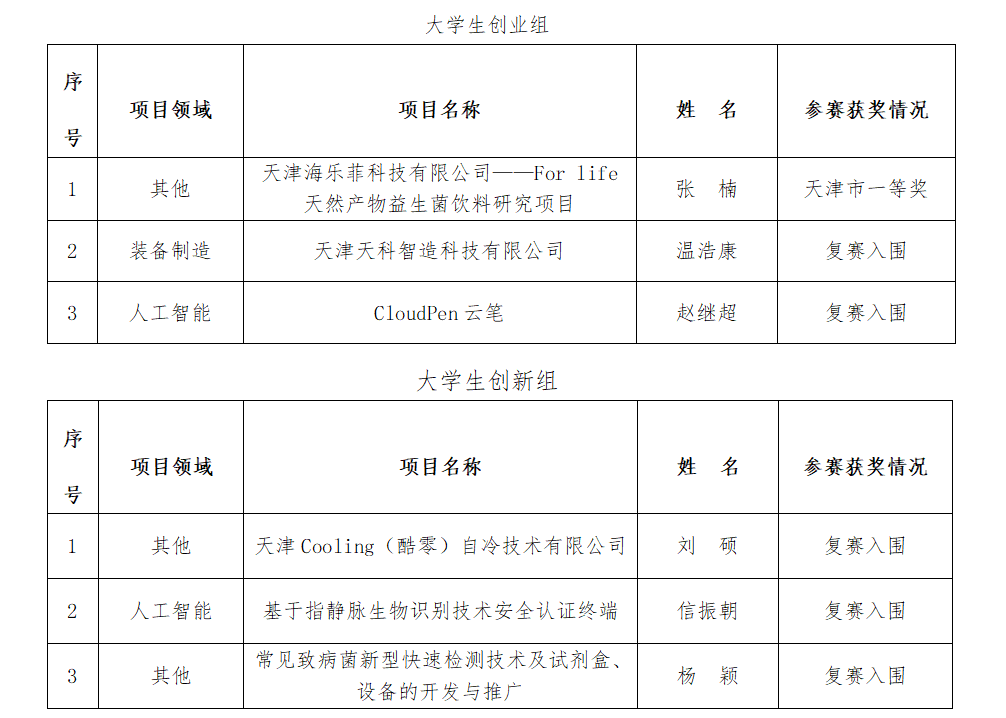 近日,由天津市人社局牵头主办的首届天津市“海河英才”创业大赛发布获奖名单,我校张楠同学负责的《益菌突起,开启肠道健康时代》项目一举获得创业组一等奖的佳绩,信振朝等同学的其他5个团队项目也一并挺进复赛。