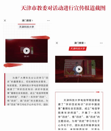 为使广大青年大学生学好“四史”,讲好中国故事,电信学院组建了青年讲师团,并根据每名讲师团的家乡实际以及自身特点量身定制宣讲方案。讲师团成员通过探寻家乡历史,结合着一处处地标、一件件文物,讲述一段段故事、歌颂一曲曲赞歌,用火红的资源为“四史”教育提供生动的学习素材。讲师团成员将学习成果录制成九期微课,并通过天津市教委“津门教育”、天津科技大学、天津科技大学团委等微信公众号,搜狐网、天津日报等平台刊播,社会反响良好。同时还和天津电视台《大家说理》以及《新闻会客厅》等栏目合作,录制了“四史平津”和“幸福新蓝图”的微访谈作品。实践团紧密结合“三全育人”工作,充分运用好学生宿舍、课堂、班会等载体,分众化、精准化推进学好“四史”知识的再深化。