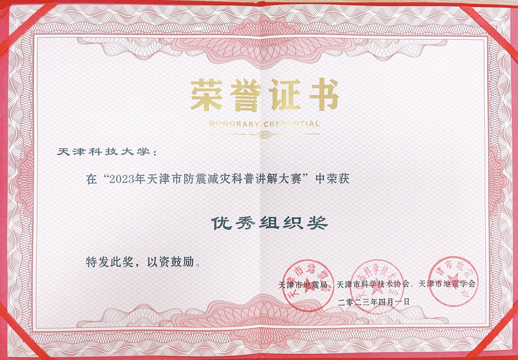 为弘扬科学精神、普及防震减灾知识,天津市地震局联合市教委、市应急局、市科技局、市科协、市地震学会举办2023年天津市防震减灾科普讲解大赛暨第七届全国防震减灾科普讲解大赛选拔赛,赛事于近日圆满收官,我校化工与材料学院学生赵天航荣获(成人组)优秀奖,化工与材料学院辅导员张晓飞荣获优秀指导教师,我校荣获优秀组织单位荣誉称号。