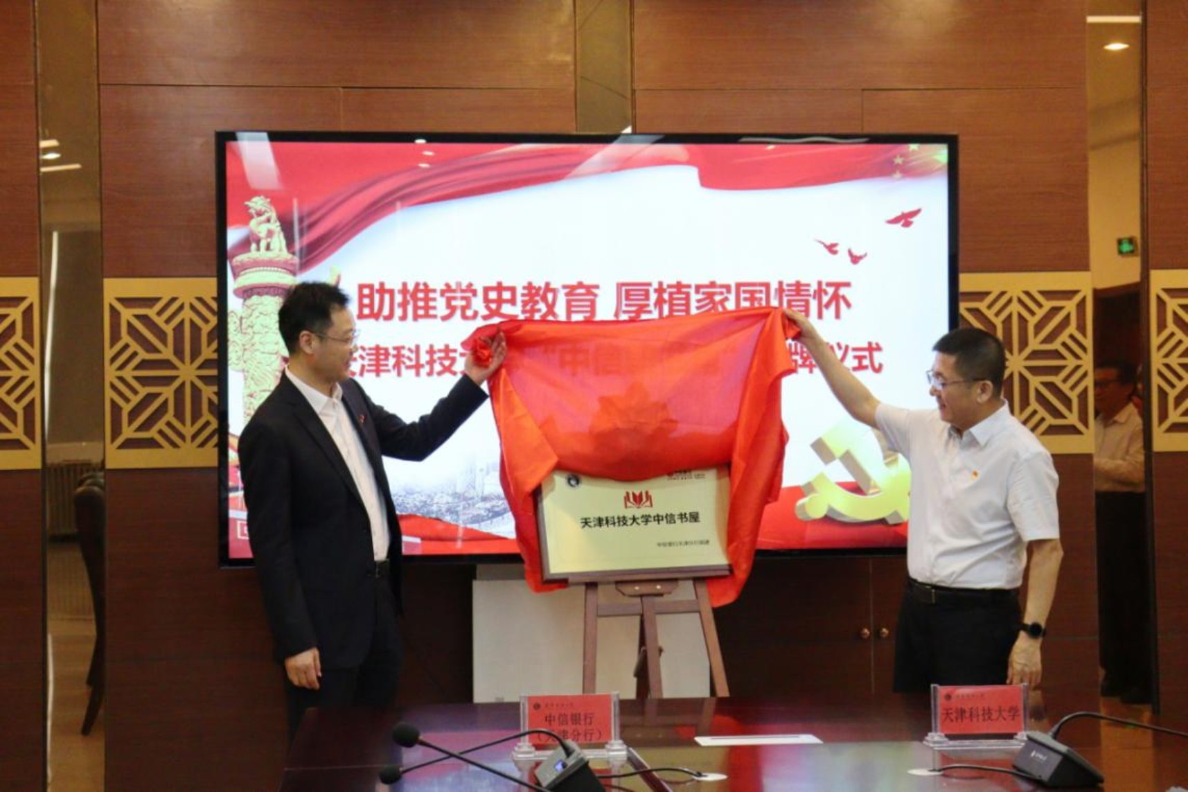 6月10日下午,中信银行(天津分行)-天津科技大学战略合作协议签订暨全国首个高校“中信书屋”揭幕仪式在天津科技大学滨海西校区言泉楼顺利举行。天津科技大学党委书记韩金玉,党委常委、副校长安玉健,中信银行天津分行党委书记、行长石嘉,纪委书记吴立国出席仪式。校企双方相关部门负责人参加仪式。