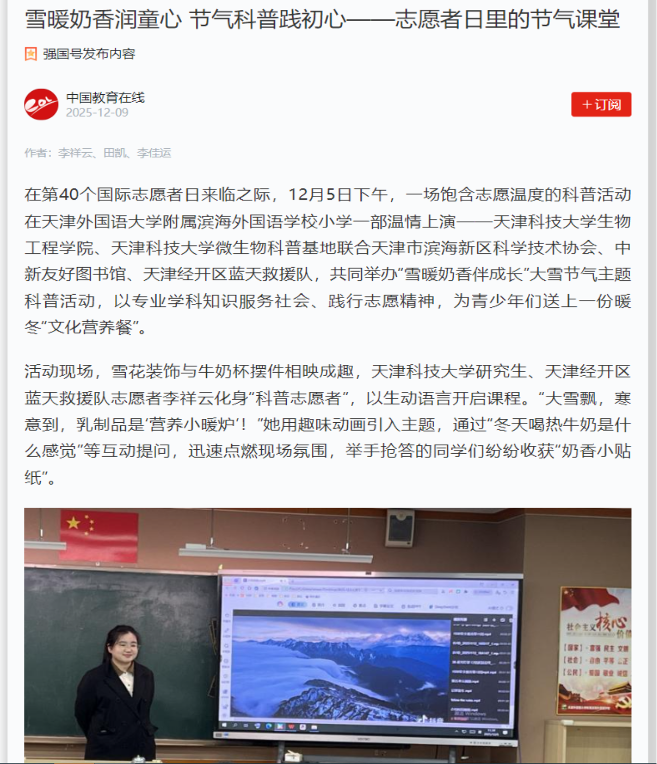 12月9日,学习强国、中国教育在线以题为《雪暖奶香润童心 节气科普践初心——志愿者日里的节气课堂》报道天津科技大学生物工程学院、微生物科普基地联合天津市滨海新区科学技术协会、中新友好图书馆、天津经开区蓝天救援队,共同举办“雪暖奶香伴成长”大雪节气主题科普活动,以专业学科知识服务社会、践行志愿精神,为青少年们送上一份暖冬“文化营养餐”。