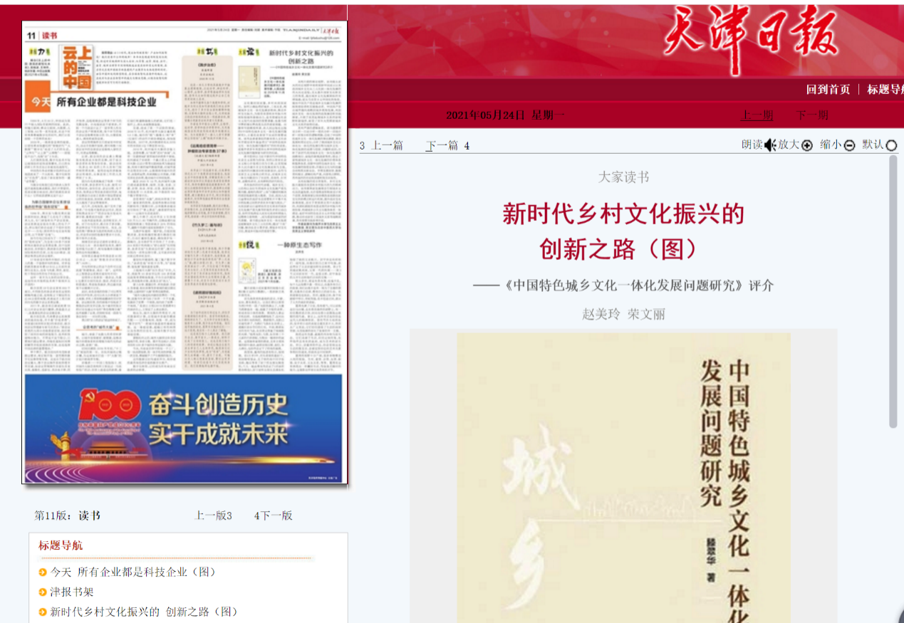 近日,天津日报刊发《新时代乡村文化振兴的创新之路》──《中国特色城乡文化一体化发展问题研究》评介。《中国特色城乡文化一体化发展问题研究》一书是由我校马克思主义学院滕翠华副教授所著,由人民出版社出版的《中国特色城乡文化一体化发展问题研究》,正是在此背景下完成的重要成果。该书是著者承担的教育部人文社会科学规划青年基金项目“中国特色城乡文化一体化发展问题研究”的结项成果,更是作者多年来坚持从事中国特色城乡文化发展问题探索与研究的结晶。