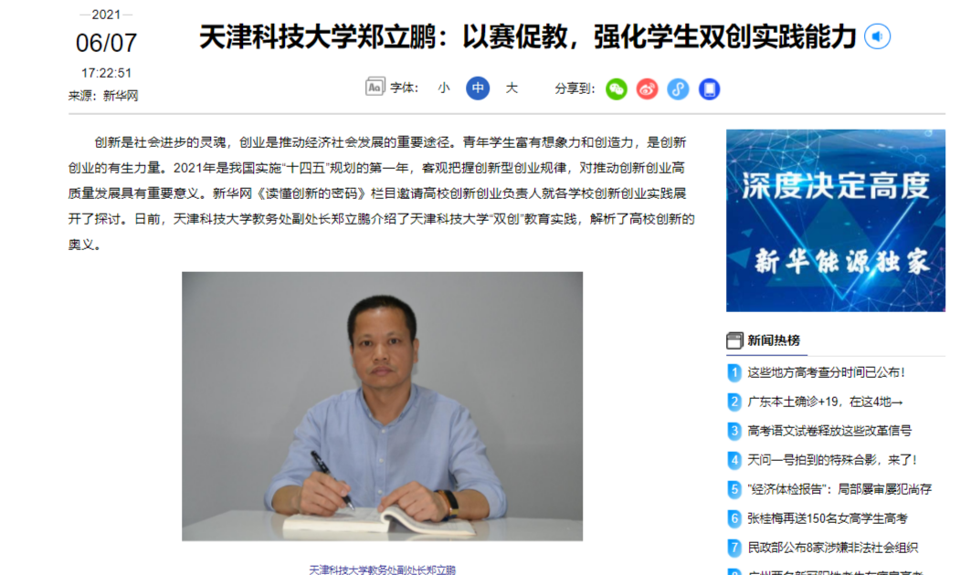 新华网客户端报道:2021年6月7日,天津科技大学郑立鹏围绕《以赛促教,强化学生双创实践能力》展开专题讲座。他指出:创新是社会进步的灵魂,创业是推动经济社会发展的重要途径。青年学生富有想象力和创造力,是创新创业的有生力量。2021年是我国实施“十四五”规划的第一年,客观把握创新型创业规律,对推动创新创业高质量发展具有重要意义。新华网《读懂创新的密码》栏目邀请高校创新创业负责人就各学校创新创业实践展开了探讨。日前,天津科技大学教务处副处长郑立鹏介绍了天津科技大学“双创”教育实践,解析了高校创新的奥义。