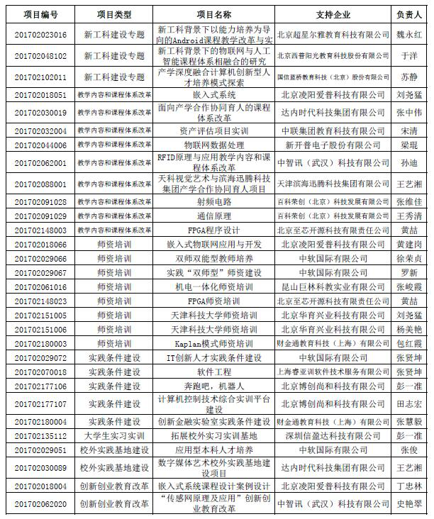 我校此次获批的30个项目,15项来自计算机科学与信息工程学院,7项来自电子信息与自动化学院,5项来自经济与管理学院,2项来自艺术设计学院,1项来自机械工程学院,获得了中软国际有限公司、北京超星尔雅教育科技有限公司、百科荣创(北京)科技发展有限公司等17家企业的支持;从项目类型上看,包括新工科教育专题项目3项,教学内容和课程体系改革项目9项、创新创业教育项目2项、校外实践基地建设项目2项、实践条件建设项目5项、师资培训项目8项、大学生实习实训项目1项,合作内容包括新工科专业建设研究、教学资源建设、教学内容和课程体系改革、产学合作实习实训基地建设、师资培训班等。