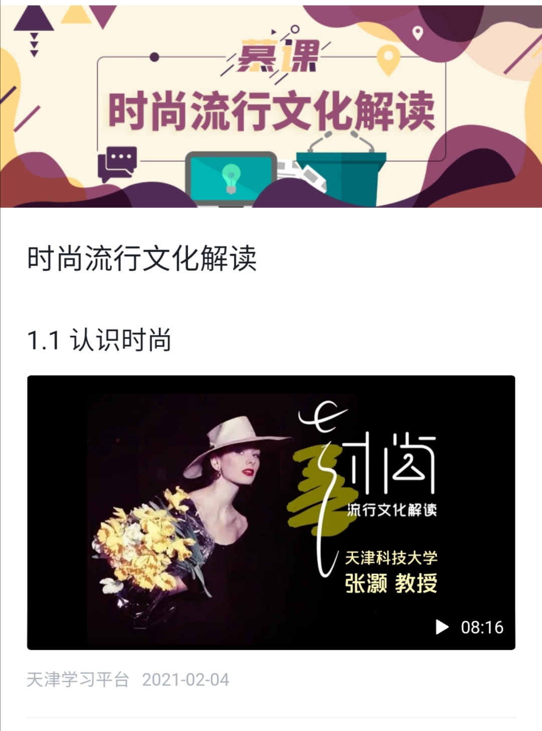 近日,天津科技大学艺术设计学院张灏教授的《时尚流行文化解读》教学课程被学习强国征集为国家精品慕课。该课程共分为68个小节,从“怎样理解时尚”、“时尚的细节”、“时装大师的创意行为”、“时装大牌的前世与今生”等方面,细致讲解了社会流行文化的变迁和差别时尚的风采,解读了时尚经典故事与流行文化内涵,让学习者能更加深刻的体会到时尚的含义,更轻松的了解时尚的发展历史。