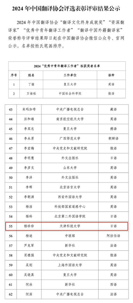 近日,2024年中国翻译协会“优秀中青年翻译工作者”荣誉称号评审结果公布,我校外国语学院杨珍珍副教授荣获“优秀中青年翻译工作者”称号。此次评选中,天津市共有4位教师获奖,杨珍珍副教授是唯一一位获此殊荣的日语翻译工作者。