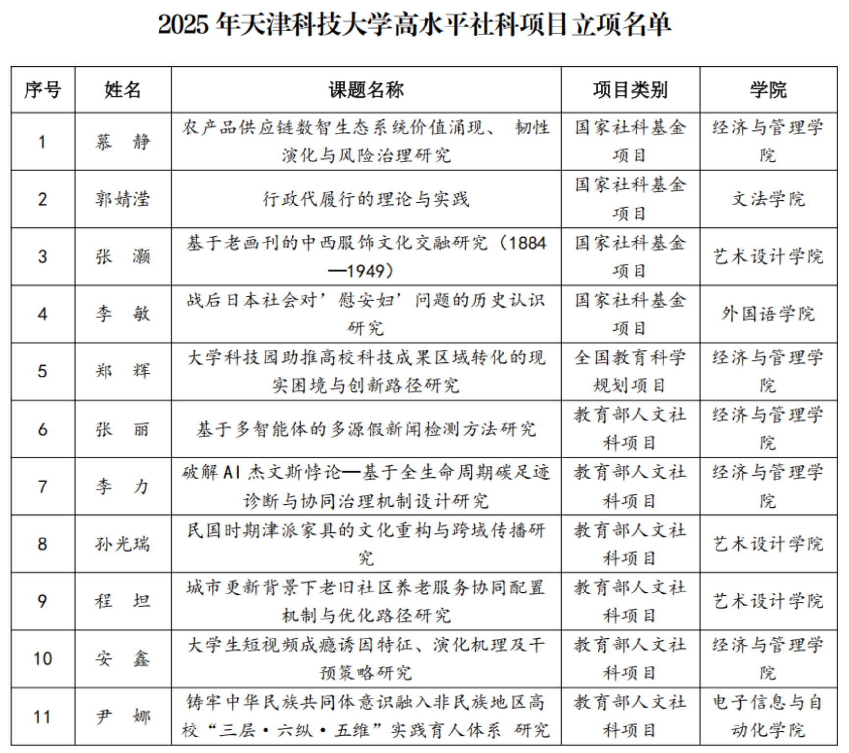 2025年,我校社科科研工作围绕“构建同向发力格局,产出精品社科成果”的工作目标,系统开展高水平社科项目申报的组织培育。社会科学高水平项目立项数量再创新高,共获批各类高水平社科项目11项,包含国家社科基金项目4项、全国教育科学规划项目1项、教育部人文社会科学研究项目6项。其中,教育部人文社会科学研究项目立项总数位居天津市属高校前列。