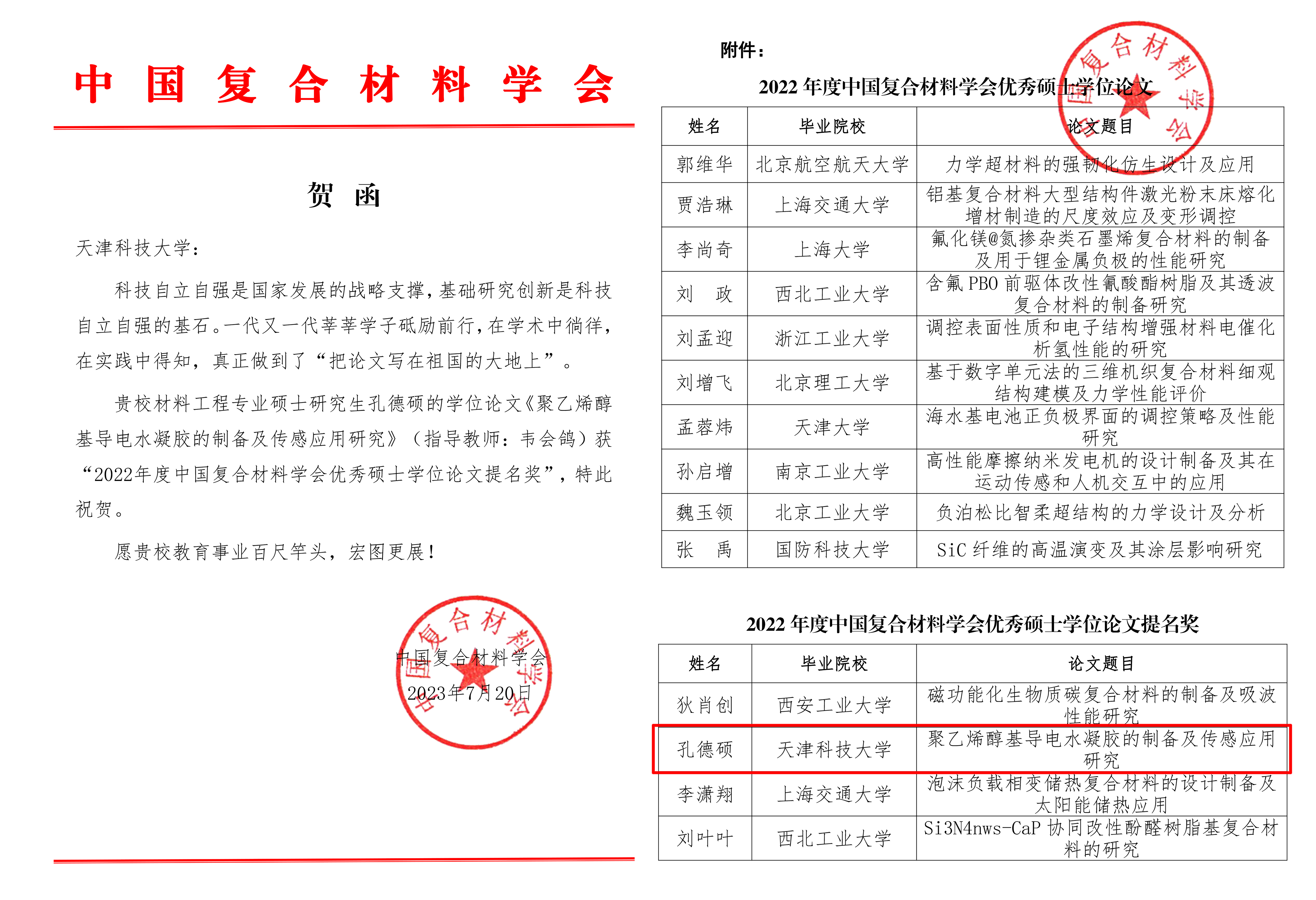 近日,经中国复合材料学会资格审查、函审和会评,共有10篇论文获评优秀硕士论文,10篇论文获提名奖。我校化工与材料学院2022届材料工程专业硕士研究生孔德硕的学位论文《聚乙烯醇基导电水凝胶的制备及传感应用研究》(指导教师:韦会鸽)获“2022年度中国复合材料学会优秀硕士学位论文提名奖”。