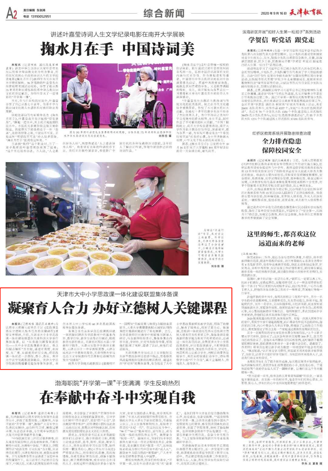 近日,天津教育报刊发《天津推进大中小学思政课一体化建设联盟集体备课——凝聚育人合力 办好立德树人关键课程》报道天津市大中小学思政课一体化建设联盟在我校举行集体备课。以“从香港问题看制度自信——大中小思政课教学重点、难点和疑点解析”为主题,通过有高度、有深度、有广度、有温度的研讨交流,将思政课一体化进一步落细、落小、落实。