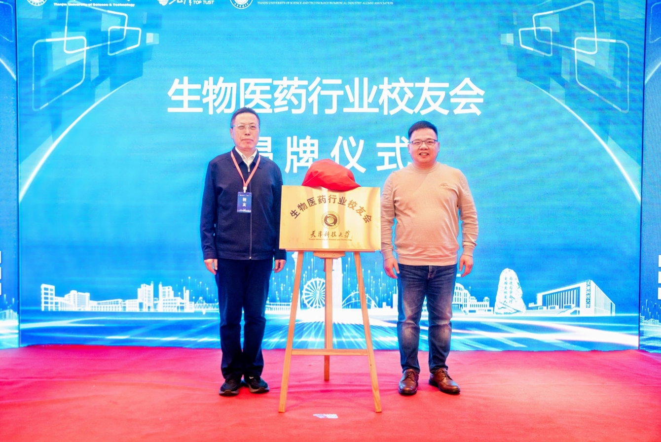 路福平与蔡兴旺共同为“天津科技大学生物医药行业校友会”揭牌,路福平为蔡兴旺颁发会长聘书。