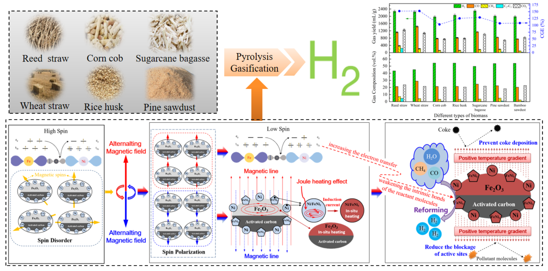 热解/气化装置和催化剂性能在农业生物质热转化制氢过程中起着关键作用。针对目前热解/气化装置热能转换效率不高和催化剂易失活等痛点问题,作者构思了一种新型热解/气化技术和装置策略:利用焦耳热效应原位加热磁性催化剂中Ni原子和Fe2O3载体。通过耦合调控电-热转换过程及Ni/Fe2O3在催化剂中空间分布浓度,使得“自热”的催化剂表面形成最佳的正温度梯度,并且激发Ni-Fe活性,从而强化催化剂的反应性能。将新技术应用于多种典型的生物质(芦苇秆、小麦秸秆、玉米芯、稻壳、甘蔗渣、木屑等)进行催化气化制备氢气,结果表明,新技术可以大幅度提升生物质气化制氢的产率,最高增幅达到209%,氢气产量也明显高于目前文献中报道的水平。本研究工作将为农业生物质转化清洁能源产品提供新思路,助力“碳中和、碳达峰”目标。本研究工作得到了国家自然科学基金青年项目和中国科学院可再生能源重点实验室开放基金的支持。