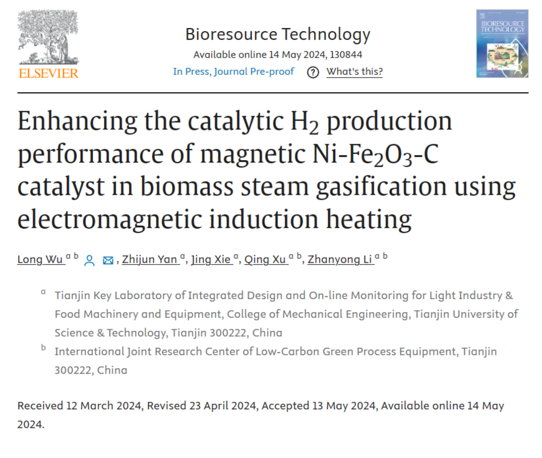 近日,天津科技大学机械工程学院低碳绿色过程装备团队吴龙副教授及其所在课题组成员,针对农业生物质资源化和能源化过程中氢转化效率低的问题进行了研究,相关研究成果以题为“Enhancing the catalytic H2 production performance of magnetic Ni-Fe2O3-C catalyst in biomass steam gasification using electromagnetic induction heating”发表在农业工程/能源工程领域国际Top期刊《Bioresource Technology》上。该论文第一作者和通讯作者为我校机械工程学院教师吴龙,天津科技大学为唯一通讯作者单位(DOI: https://doi.org/10.1016/j.biortech.2024.130844)。