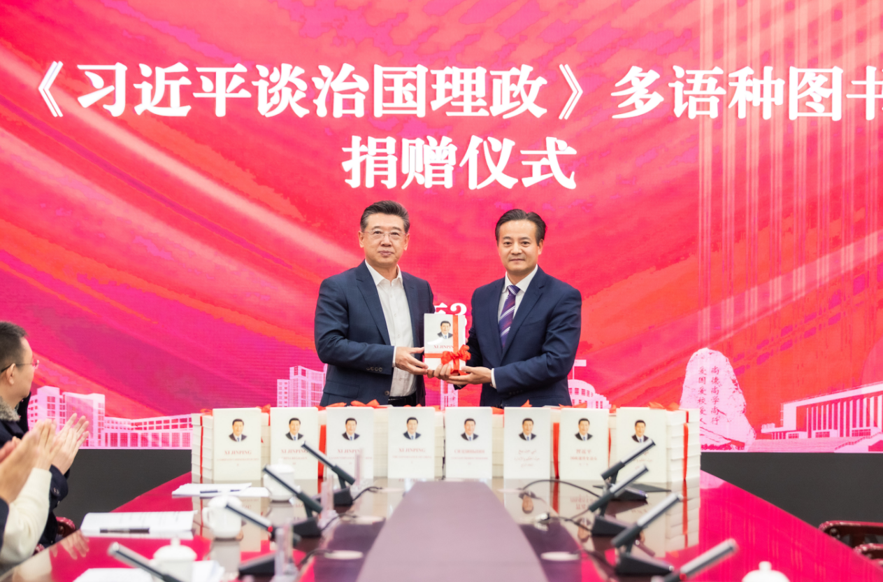 校党委办公室、党委宣传部、社会科学处、国际交流处、图书馆、马克思主义学院、外国语学院等有关部门和单位负责人及师生代表参加捐赠仪式。