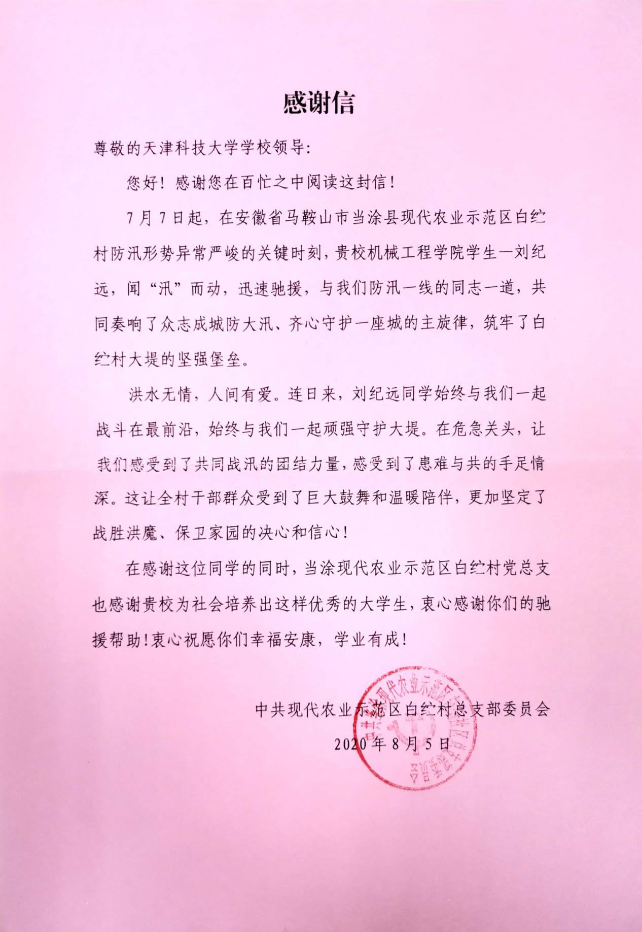 近日,我校收到了两封来自安徽省马鞍山市当涂县中共现代农业示范区白纻村总支部委员会和当涂县精神文明建设指导委员会办公室的感谢信,信中对我校机械工程学院2018级刘纪远同学提出了表扬。感谢他在今年暑期白纻村防汛形势异常严峻的关键时刻,闻“汛“而动,迅速驰援,与当地防汛一线的工作人员一起奏响了众志成城防大汛、齐心守护一座城的旋律。