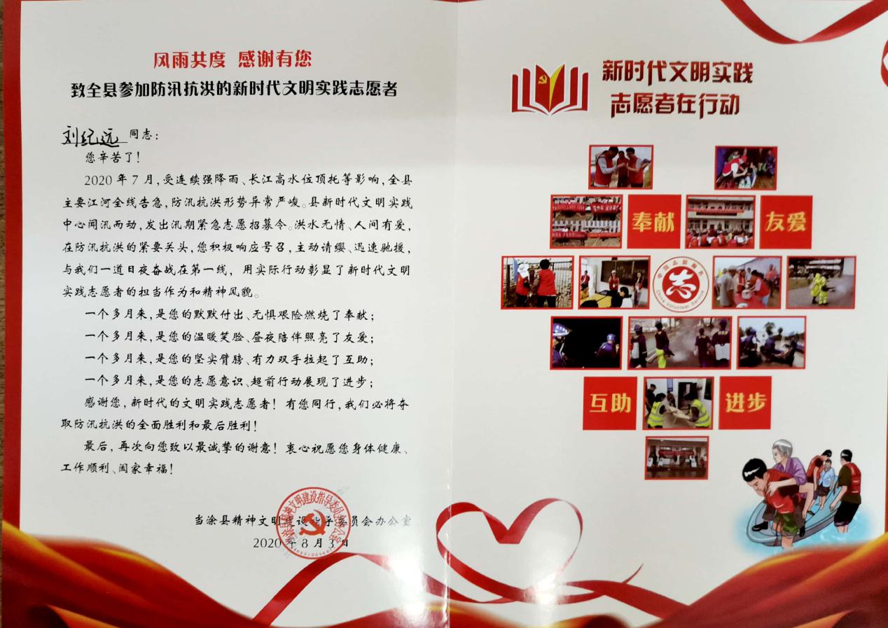 2020年7月,受连续强降雨、长江高水位顶托等影响,全当涂县主要江河全线告急,防汛抗洪刻不容缓,形势异常严峻。在这危机关头,机械工程学院2018级同学刘纪远积极响应号召、主动请缨,一个多月来一直坚守在抗洪第一线,用实际行动展现了当代大学生的担当和精神风貌,更充分反映了机械工程学院“立德树人”的育人成果。