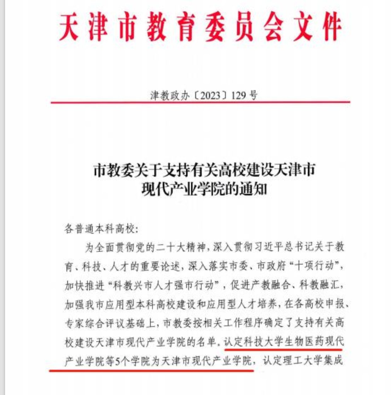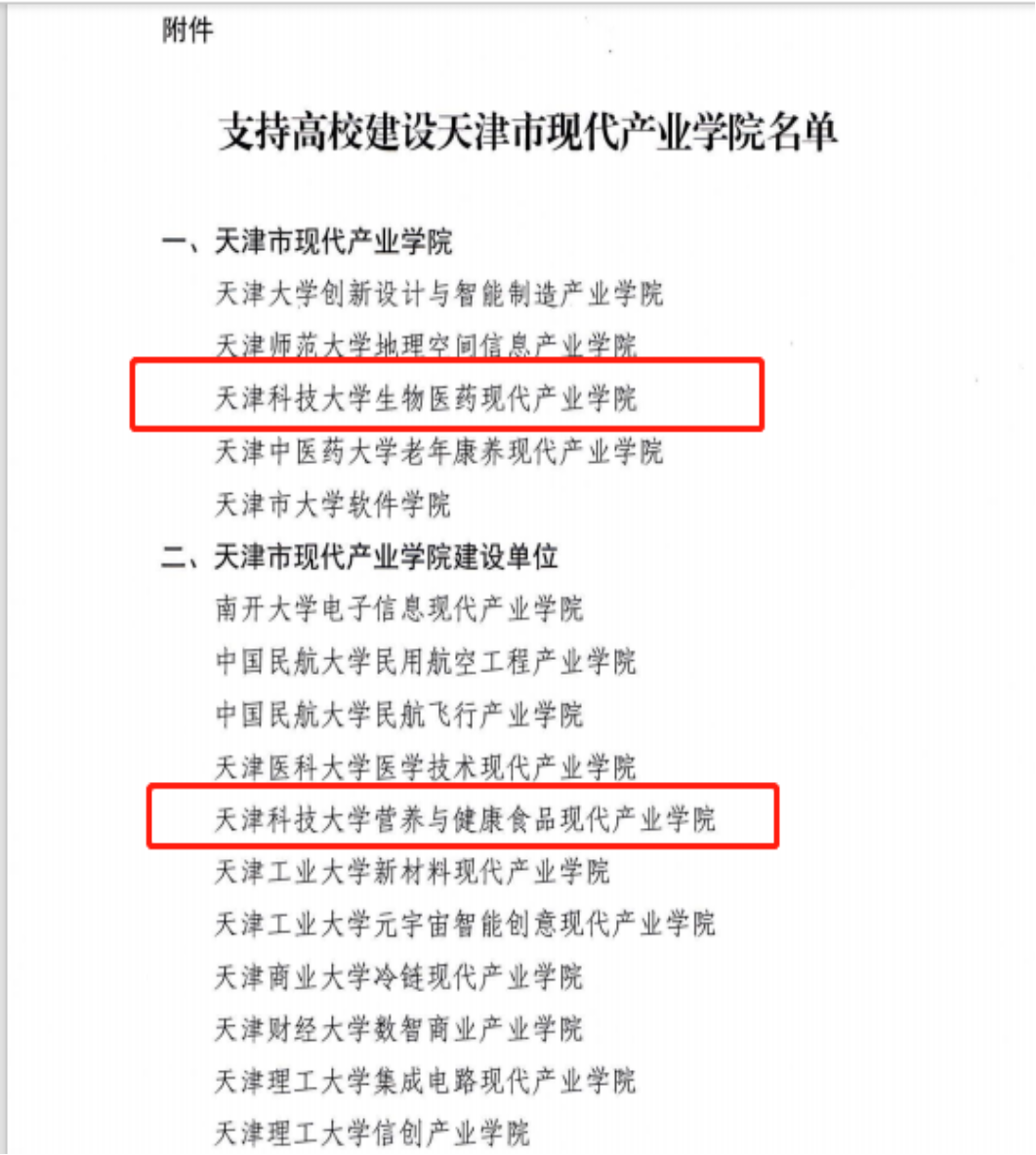 9月11日,天津市教委公布支持有关高校建设天津市现代产业学院名单,我校生物医药现代产业获批天津市级现代产业学院,营养与健康食品现代产业学院获批天津市现代产业学院建设单位。上述名单的公布,标志着我校推进产业学院建设取得突破性进展。
