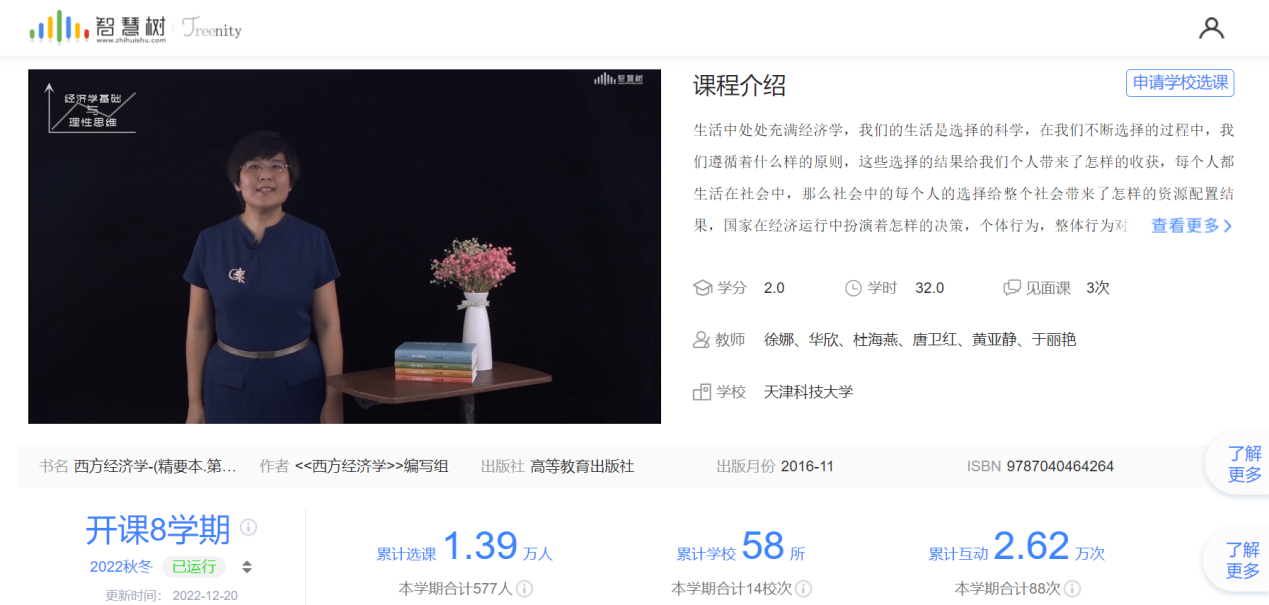 由经济与管理学院徐娜教授担任课程负责人的《经济学基础与理性思维》课程历经12年建设,目前选课院校达到58所,选课人数2.62万人。课程基于跨学科复合型创新人才培养目标,建设“MOOC+SPOC+APP”的信息化创新课程,注重“行业+经济+创新创业”的内容重构,建成全方位的立体课程资源体系,通过混合式改革,实施“讨论+工作坊+圆桌会议”的项目式教学,开展“多元交互”式课程思政输出模式,创新构建PPDC考核评价模式,有效提升了学生跨学科整合研究能力和创新素养。该课程先后获批天津市高校新时代课程思政改革精品课、天津市级一流本科课程,课程教学创新改革获得第三届全国高校混合式教学设计创新大赛二等奖。