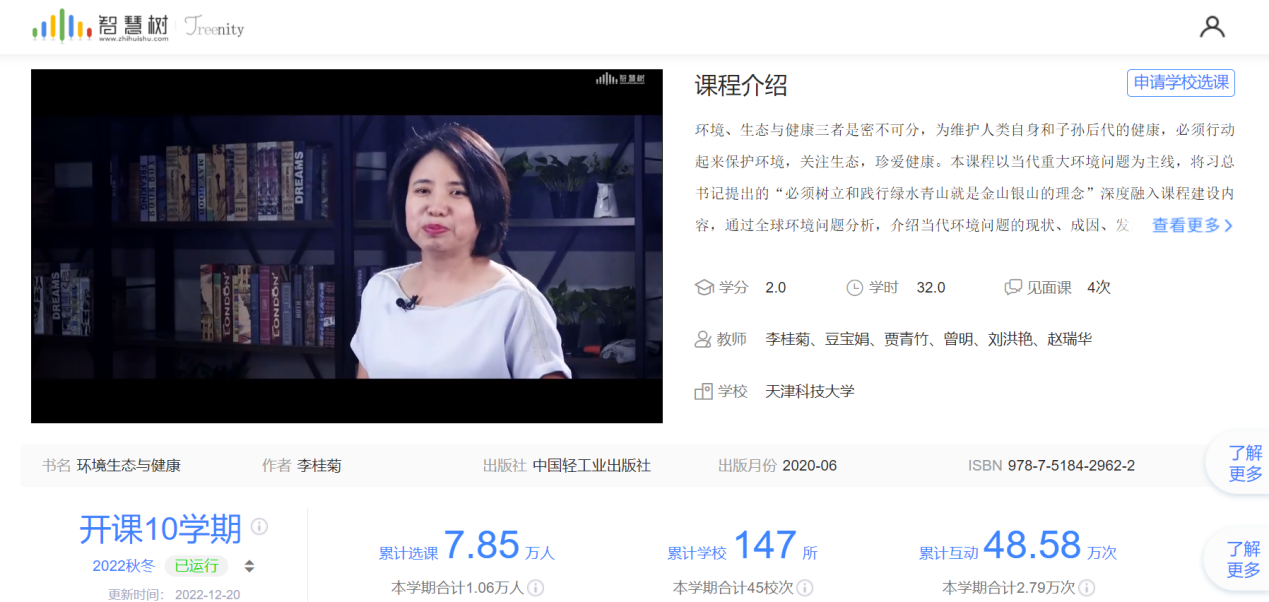由海洋与环境学院李桂菊教授担任课程负责人的《环境生态与健康》课程历经近20年建设,是我校首批建设MOOC的个性化课程,目前已线上运行10个学期,累计147所学校选课,选课人数7.85万人。课程以问题为导向,将学科交叉的思想与方法融入教学,通过知识内容层次化,教学内容1+X差异化,多重融合同步化实现教学内容立体化;创建“双自-双驱-双拓”教学模式,实现课前自主学习,自主测试,课中任务驱动,评价驱动,课后实践拓展,交叉拓展,教学内容和课程思政深度融合,有效培养了学生多学科融合思维。该课程先后获批天津市高校新时代课程思政改革精品课、天津市级一流本科课程,课程教学创新改革获得第七届西浦全国大学教学创新大赛一等奖、第三届全国高校混合式教学设计创新大赛三等奖;首届全国高校教师教学创新大赛天津赛区二等奖等奖项。