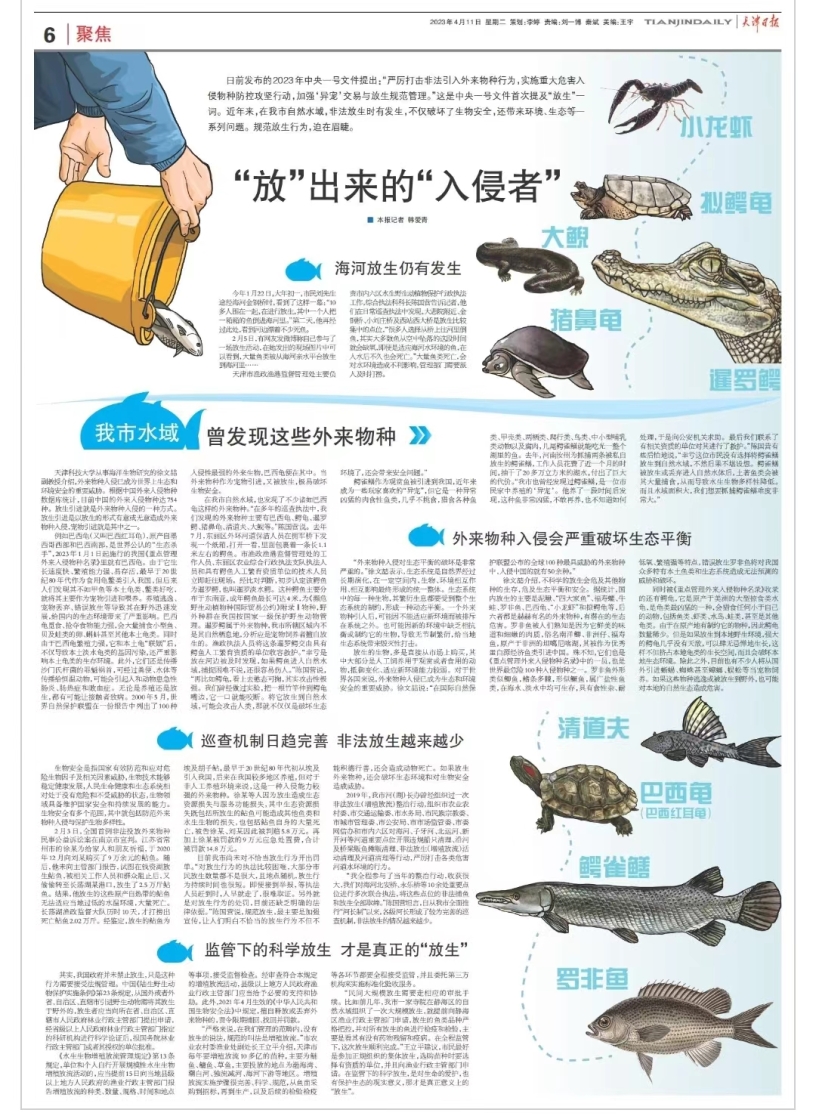 日前发布的2023年中央一号文件提出:“严厉打击非法引入外来物种行为,实施重大危害入侵物种防控攻坚行动,加强‘异宠’交易与放生规范管理。”这是中央一号文件首次提及“放生”一词。近年来,在我市自然水域,非法放生时有发生,不仅破坏了生物安全,还带来环境、生态等一系列问题。规范放生行为,迫在眉睫。